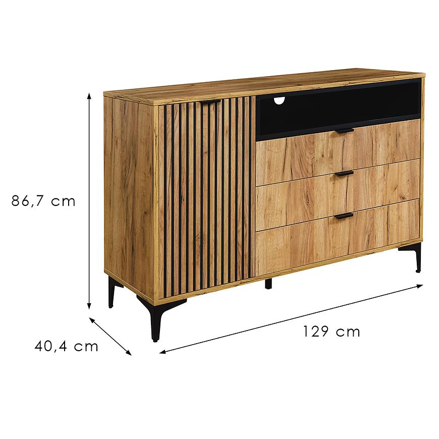 Fronty komody wykonane zostały z trwałej płyty MDF, co zapewnia elegancki wygląd i długotrwałą wytrzymałość, natomiast korpus z płyty wiórowej laminowanej gwarantuje stabilność mebla. Matowe wykończenie frontów i korpusu podkreśla nowoczesny charakter komody, a jednocześnie sprawia, że jest ona łatwa w utrzymaniu czystości. Kolor craft złoty to jasne, drewnopodobne wybarwienie, które harmonizuje z różnymi stylami wnętrz, od nowoczesnych po bardziej klasyczne aranżacje.