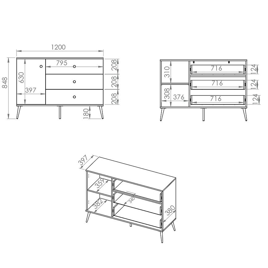 Materiały: Zarówno fronty, jak i korpus komody wykonane są z wysokiej jakości płyty wiórowej laminowanej. Ten materiał zapewnia trwałość i odporność na codzienne użytkowanie, a także łatwość w utrzymaniu czystości.