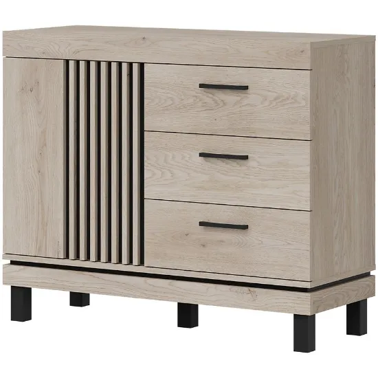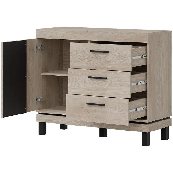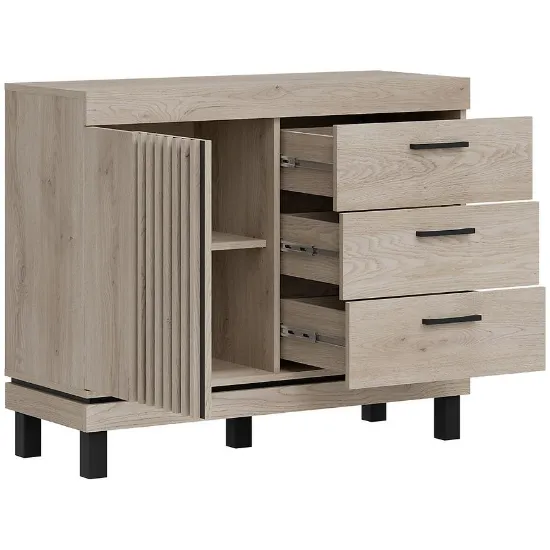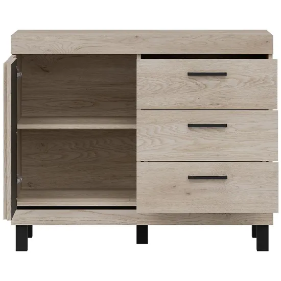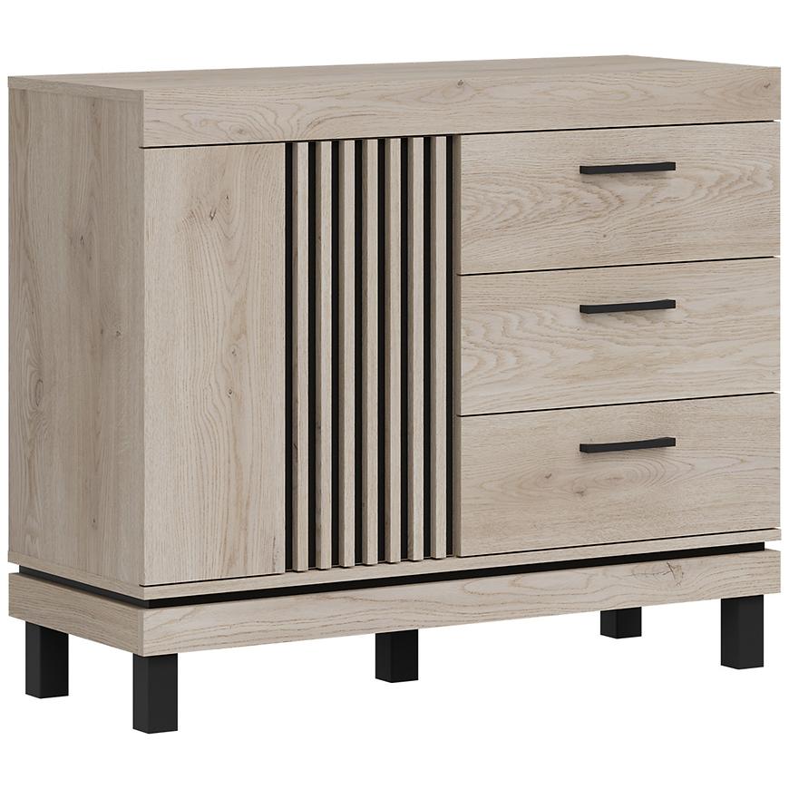 Komoda Mati to stylowy i praktyczny mebel, który doskonale wpisuje się w nowoczesne wnętrza. Jednodrzwiowa konstrukcja z dodatkowymi trzema szufladami zapewnia dużą ilość miejsca do przechowywania, pomagając utrzymać porządek w salonie, sypialni lub gabinecie.