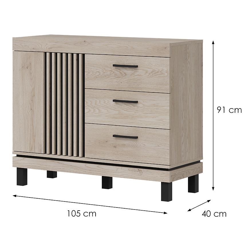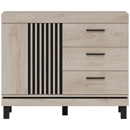 Połączenie dekoru dąb cremona cotta z głęboką czernią nadaje komodzie elegancki i ponadczasowy wygląd, podkreślony matowym wykończeniem. Solidna konstrukcja wykonana z laminowanej płyty wiórowej gwarantuje trwałość oraz odporność na codzienne użytkowanie. Kolekcja MATI to doskonały wybór dla osób poszukujących nowoczesnych i funkcjonalnych rozwiązań do swojego wnętrza.