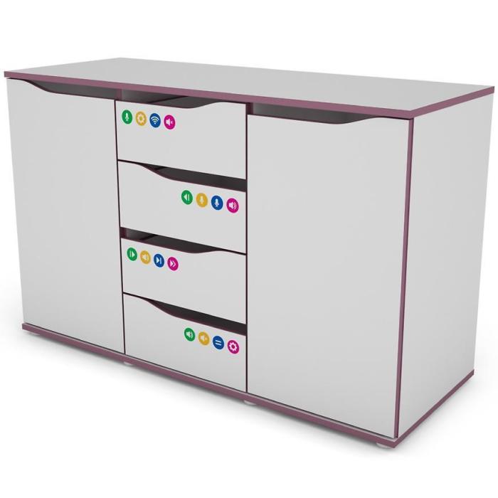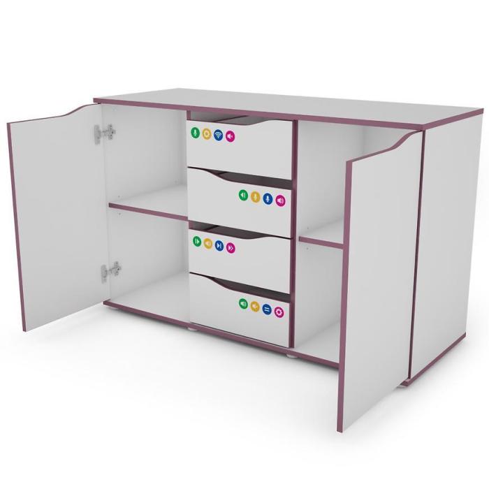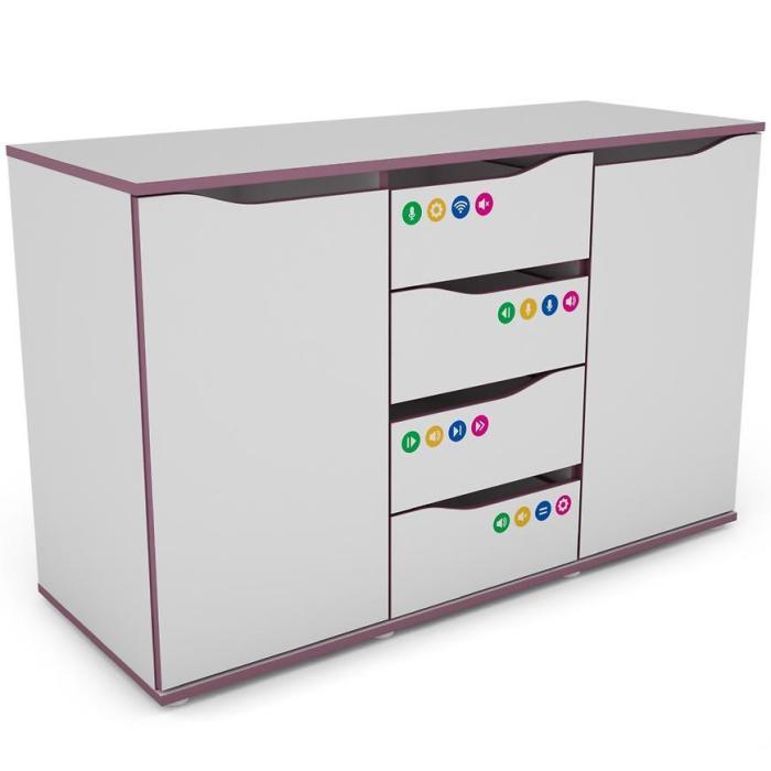 Komoda Matrix w kolorze biały/fiolet to przede wszystkim nowoczesność i funkcjonalność w jednym. Mebel doskonale sprawdzi się w każdym pokoju młodzieżowym. Materiał wykonania to płyta wiórowa laminowana. Komoda posiada cztery szuflady i dwie szafki z półkami dzięki czemu ma łatwy dostęp do wnętrza. Wygląd mebli jest nowoczesny, a zarazem uniwersalny. Mebel do samodzielnego montażu.
