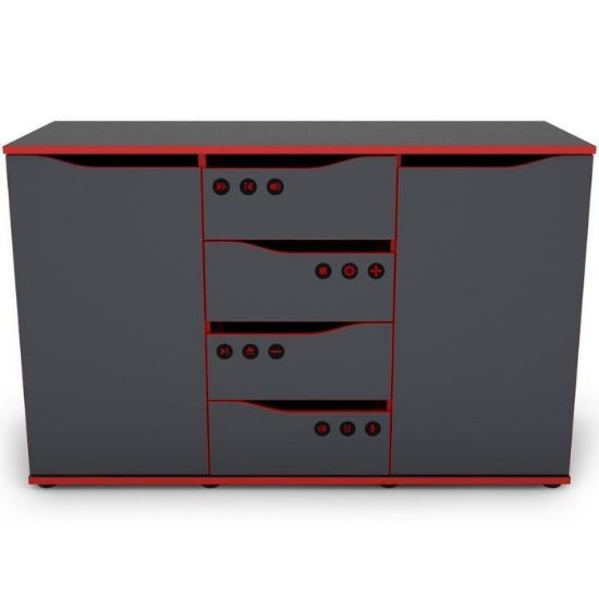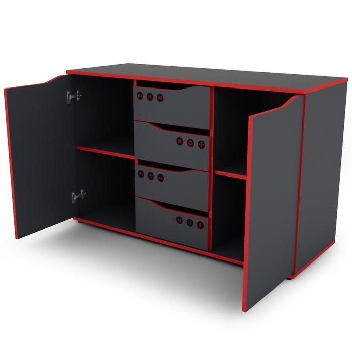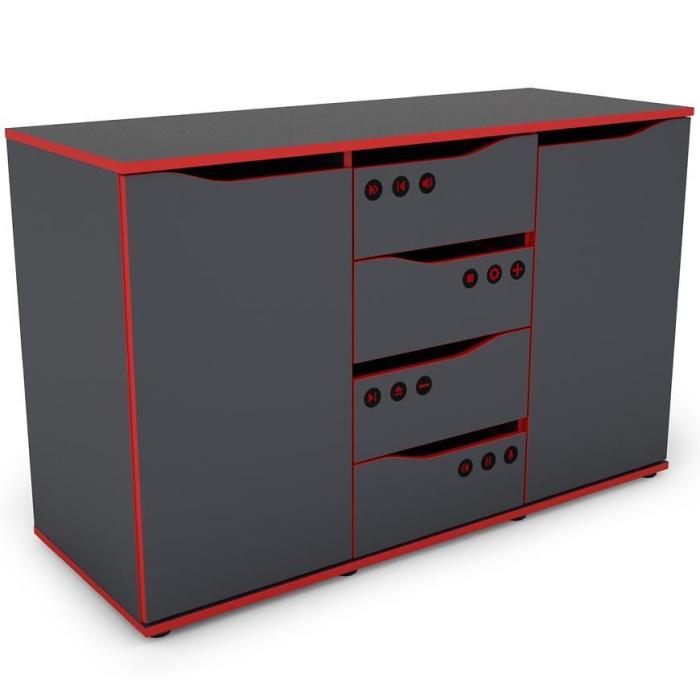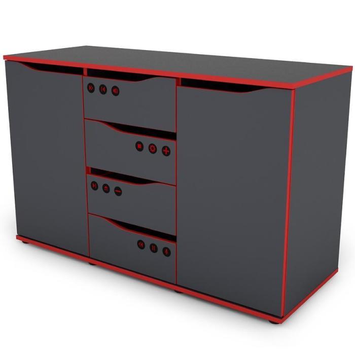 Komoda Matrix w kolorze grafit/czerwony to przede wszystkim nowoczesność i funkcjonalność w jednym. Mebel doskonale sprawdzi się w każdym pokoju młodzieżowym. Materiał wykonania to płyta wiórowa laminowana. Komoda posiada cztery szuflady i dwie szafki z półkami dzięki czemu ma łatwy dostęp do wnętrza. Wygląd mebli jest nowoczesny, a zarazem uniwersalny. Mebel do samodzielnego montażu.