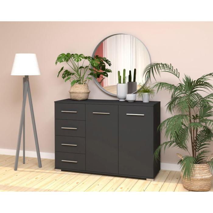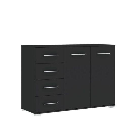 Komoda z kolekcji Max to doskonała propozycja do sypialni lub do przedpokoju. Doskonale sprawdzi się również w pokoju dziennym. Posiada cztery pojemne szuflady oraz uchylne drzwi. Wykonana w płyty wiórowej laminowanej. Nóżki oraz uchwyty w kolorze srebrnym wykonane z tworzywa sztucznego. Komoda Max oferuje funkcjonalne wnętrze, a ponadto wyróżnia się klasycznym stylem. Produkt do samodzielnego montażu, pakowany z dwie paczki.