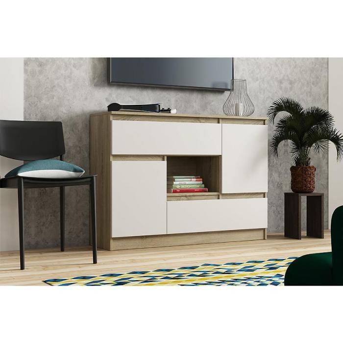 Komoda Merdia to ciekawy mebel do pokoju dziennego lub salonu. Kolor dąb sonoma/biały wpasuje się w wiele aranżacji w nowoczesnych wnętrzach jak również we wnętrzach klasycznych. Szafka posiada drzwiczki dzięki czemu ma łatwy dostęp do wnętrza oraz odpowiednią przestrzeń do przechowywania odzieży lub innych przedmiotów. Płyta laminowana to płyta, z której wykonano komodę.
