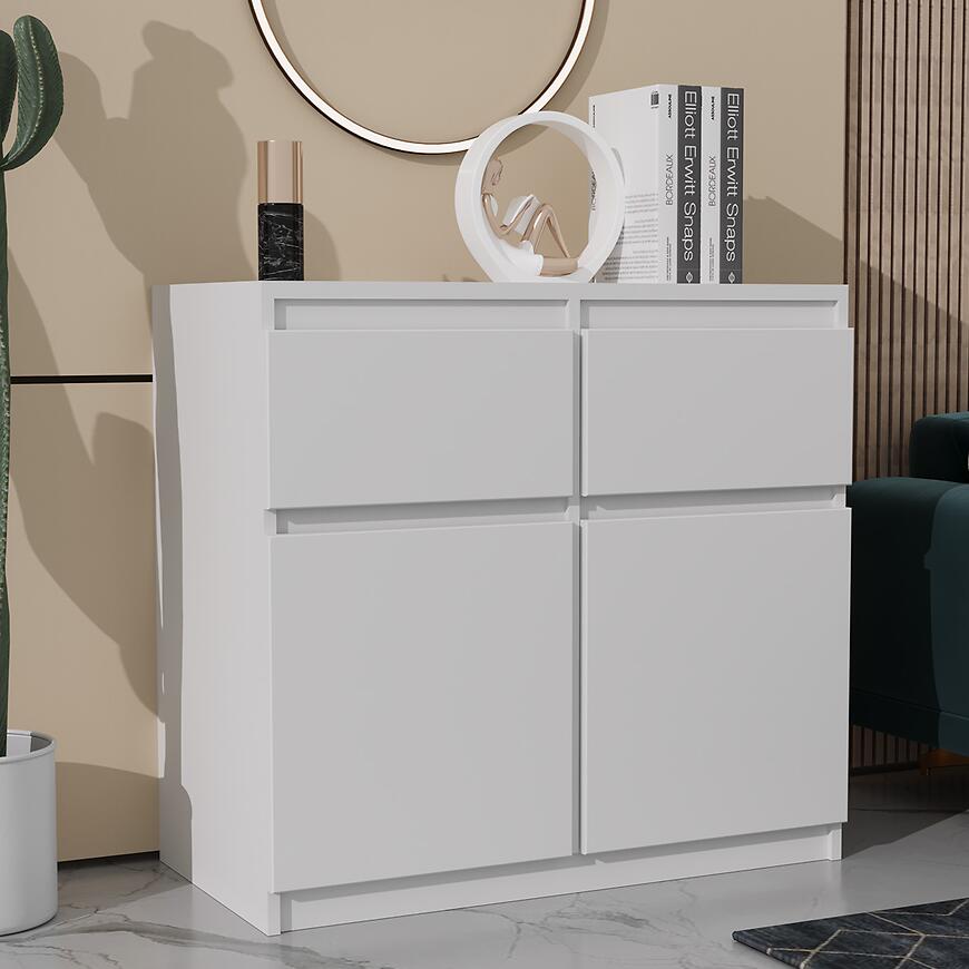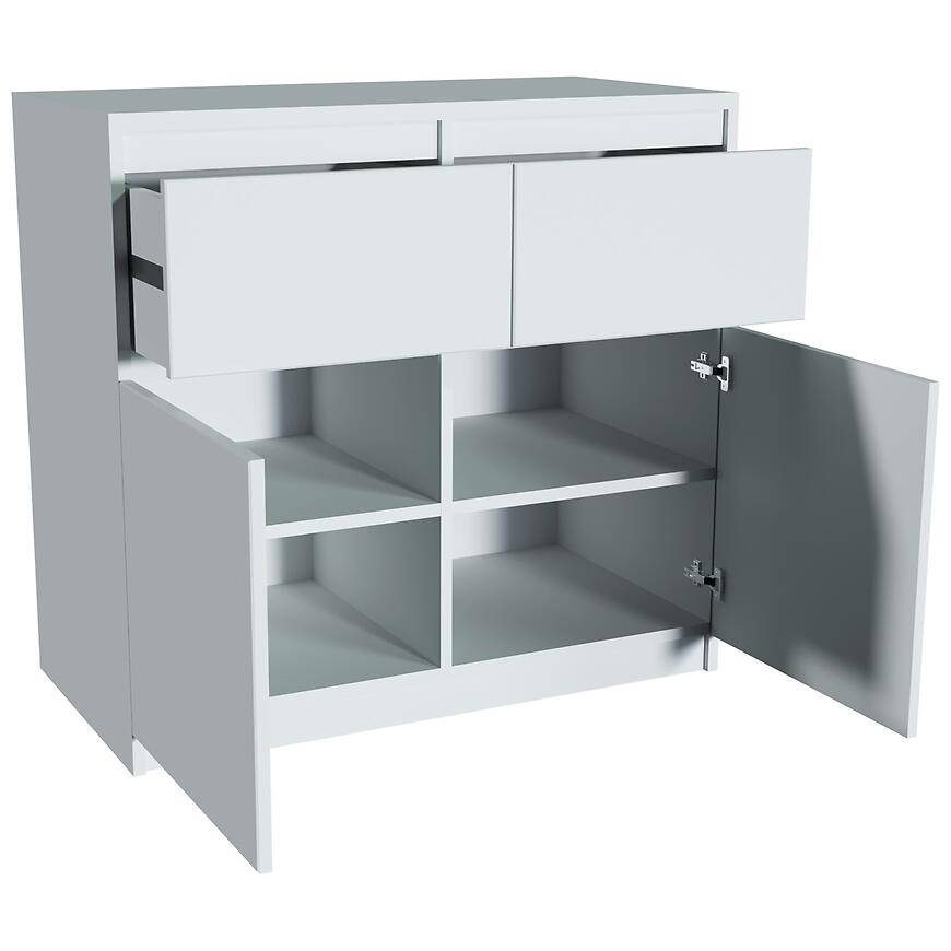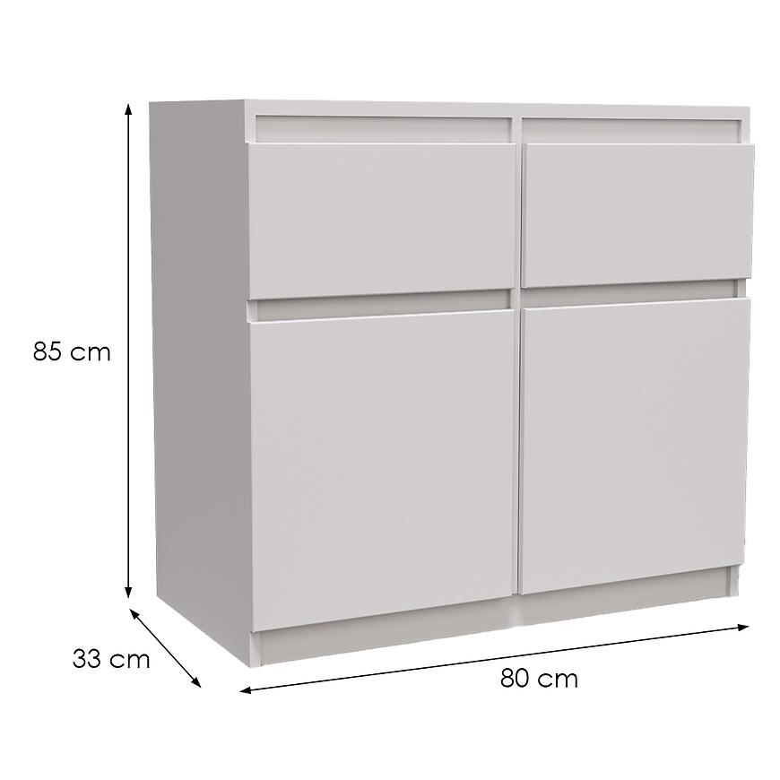 Komoda Merg 2S2F biały to funkcjonalny i nowoczesny mebel o szerokości 80 cm, wysokości 85 cm i głębokości 33 cm, który łączy elegancję z praktycznym przechowywaniem. Wyposażona w dwie drzwi oraz dwie szuflady, zapewnia miejsce na różnorodne przedmioty – od odzieży i dokumentów po akcesoria domowe. Całość utrzymana w klasycznym białym kolorze z matowym wykończeniem frontów i korpusu wprowadza do wnętrza jasność i nowoczesny charakter. Solidna konstrukcja wykonana z płyty wiórowej laminowanej gwarantuje trwałość i odporność na codzienne użytkowanie. Komoda Merg 2S2F wyróżnia się minimalistycznym designem, dzięki czemu doskonale komponuje się z różnymi aranżacjami wnętrz, a jej kompaktowe wymiary sprawiają, że idealnie pasuje zarówno do większych, jak i mniejszych przestrzeni. Mebel wymaga samodzielnego złożenia, co ułatwia transport i ustawienie w wybranym miejscu.