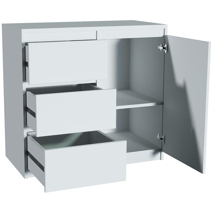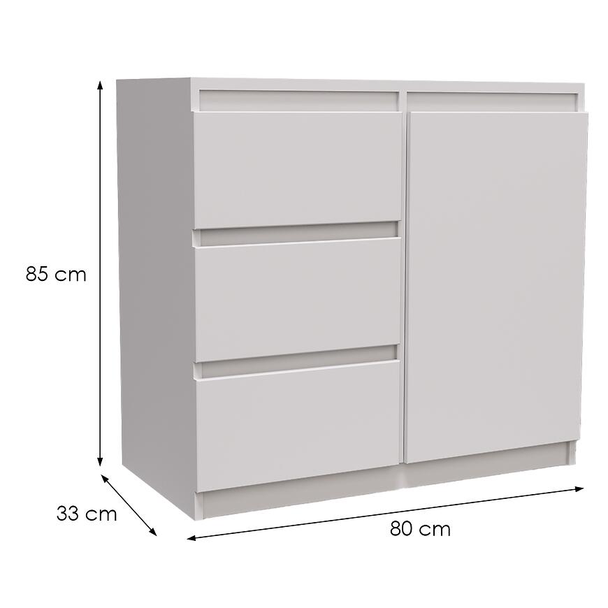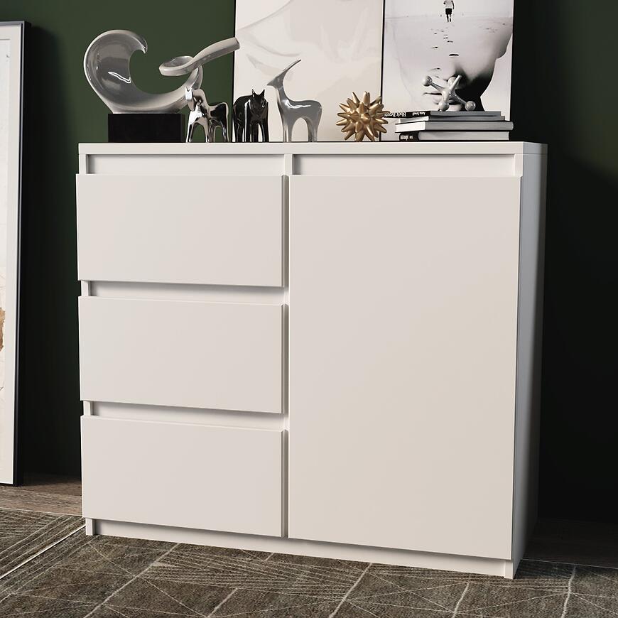 Komoda Merg 3S1F biały to funkcjonalny i nowoczesny mebel o szerokości 80 cm, wysokości 85 cm i głębokości 33 cm, który łączy praktyczność z eleganckim designem. Wyposażona w jedne drzwi oraz trzy pojemne szuflady, umożliwia wygodne przechowywanie odzieży, akcesoriów lub dokumentów, utrzymując porządek w pomieszczeniu. Biały kolor frontów i korpusu w matowym wykończeniu podkreśla minimalistyczny, nowoczesny styl i optycznie powiększa przestrzeń. Komoda wykonana jest z trwałej płyty wiórowej laminowanej, co zapewnia stabilność i odporność na codzienne użytkowanie. Jej kompaktowe wymiary pozwalają na ustawienie w różnych częściach mieszkania, a prosty design sprawia, że harmonijnie komponuje się z pozostałymi elementami wnętrza. Mebel wymaga samodzielnego złożenia, co ułatwia transport i ustawienie w wybranym miejscu.