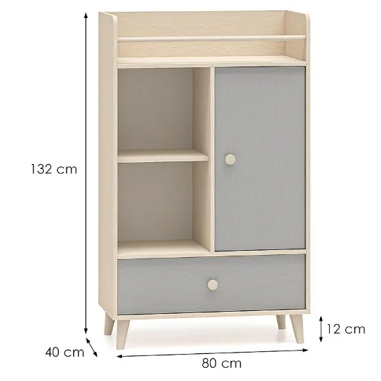 Zarówno fronty, jak i korpusy wykonano z płyty wiórowej laminowanej, co gwarantuje wysoką odporność na uszkodzenia mechaniczne i codzienne użytkowanie. Materiał ten jest odporny na zarysowania i łatwy w czyszczeniu, co ma ogromne znaczenie w przestrzeni, z której korzysta dziecko. Konstrukcja jest stabilna, a precyzyjne wykończenie zapewnia estetyczny wygląd przez długie lata.