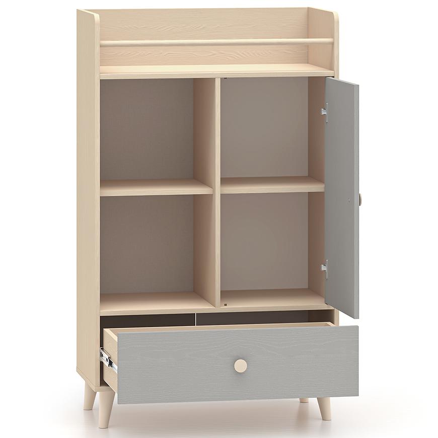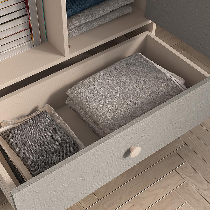 Szary pallad na frontach dodaje wnętrzu nowoczesnego charakteru, a piaskowy korpus ociepla aranżację. Meble świetnie komponują się z bielą, drewnem, pastelami czy mocniejszymi akcentami kolorystycznymi. Ich uniwersalna kolorystyka sprawia, że mogą być bazą aranżacji przez wiele lat, nawet w miarę zmieniających się potrzeb dziecka.
