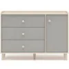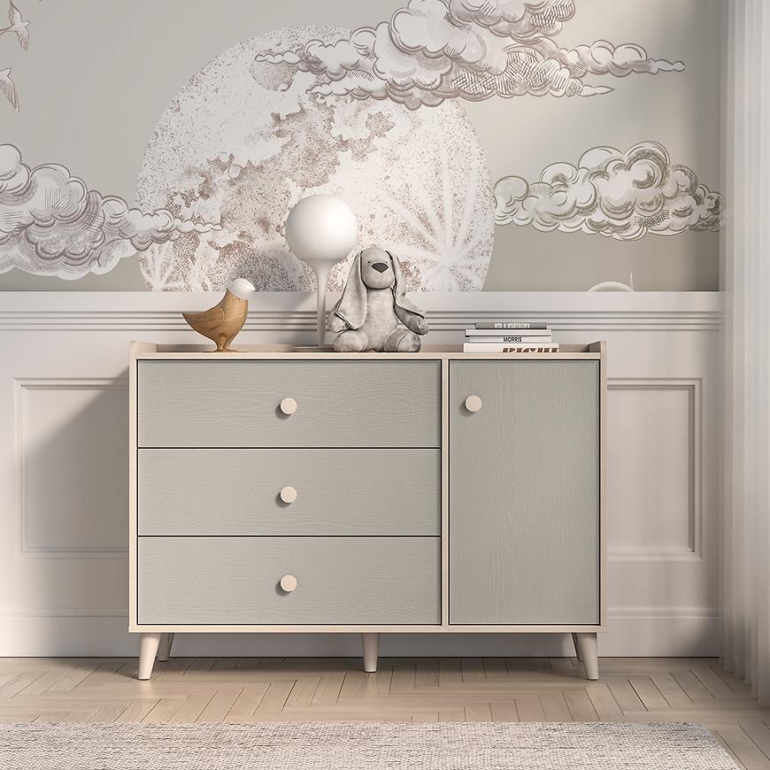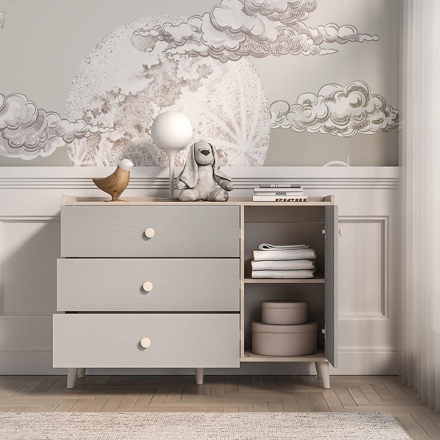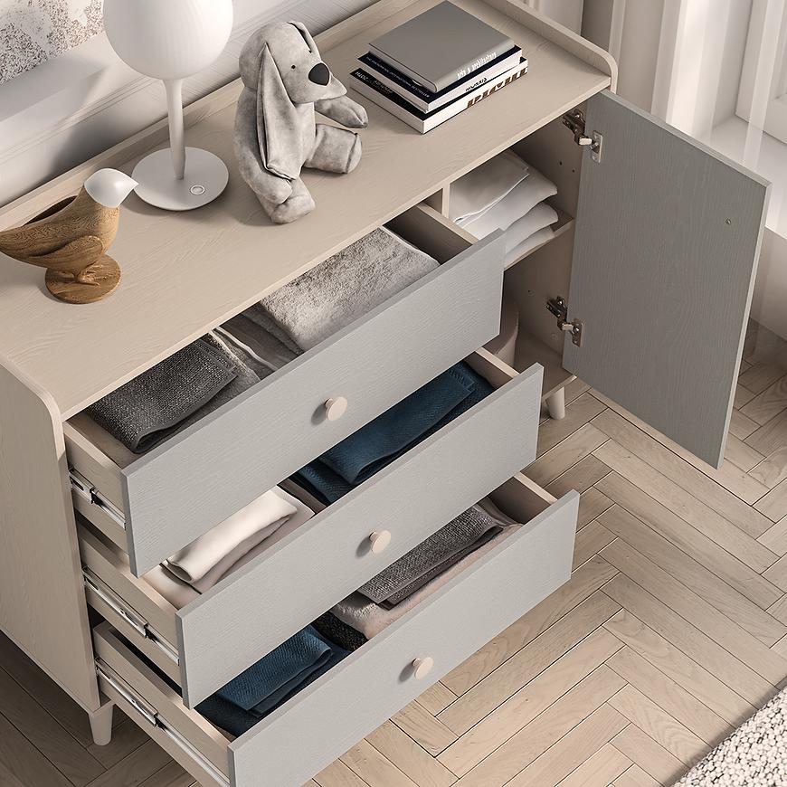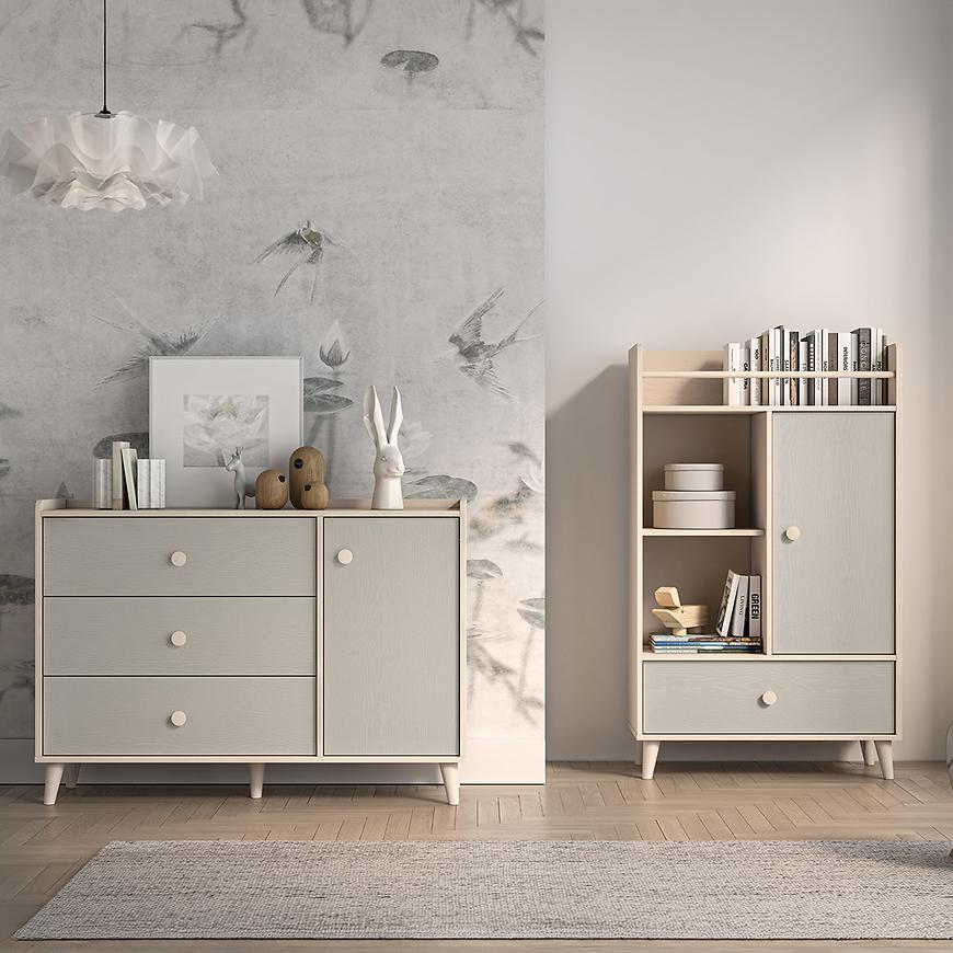 Szary pallad na frontach dodaje wnętrzu nowoczesnego charakteru, a piaskowy korpus ociepla aranżację. Meble świetnie komponują się z bielą, drewnem, pastelami czy mocniejszymi akcentami kolorystycznymi. Ich uniwersalna kolorystyka sprawia, że mogą być bazą aranżacji przez wiele lat, nawet w miarę zmieniających się potrzeb dziecka.