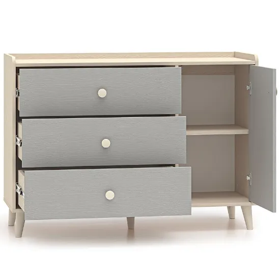 Zarówno fronty, jak i korpusy wykonano z płyty wiórowej laminowanej, co gwarantuje wysoką odporność na uszkodzenia mechaniczne i codzienne użytkowanie. Materiał ten jest odporny na zarysowania i łatwy w czyszczeniu, co ma ogromne znaczenie w przestrzeni, z której korzysta dziecko. Konstrukcja jest stabilna, a precyzyjne wykończenie zapewnia estetyczny wygląd przez długie lata.