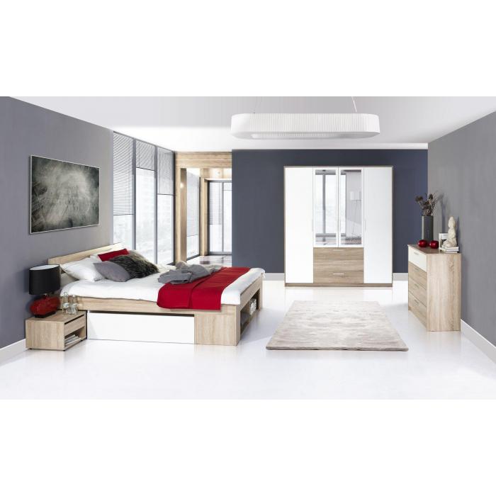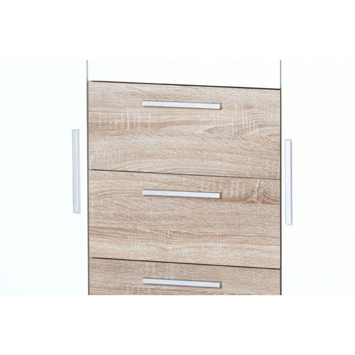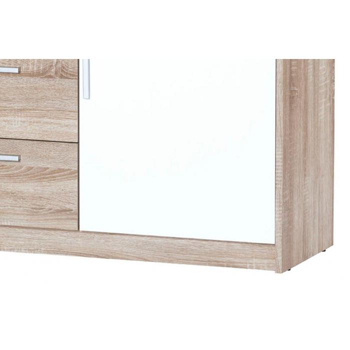 Komoda Milo to mebel idealny do sypialni. Kolor mebla biały/dąb sonoma wpasuje się w wiele aranżacji w nowoczesnych wnętrzach jak również we wnętrzach klasycznych. Szafka posiada szuflady i drzwiczki dzięki czemu ma łatwy dostęp do wnętrza oraz odpowiednią przestrzeń do przechowywania odzieży oraz innych przedmiotów. Płyta laminowana to płyta, z której wykonano komodę. Do kompletu można dokupić inne meble z kolekcji.