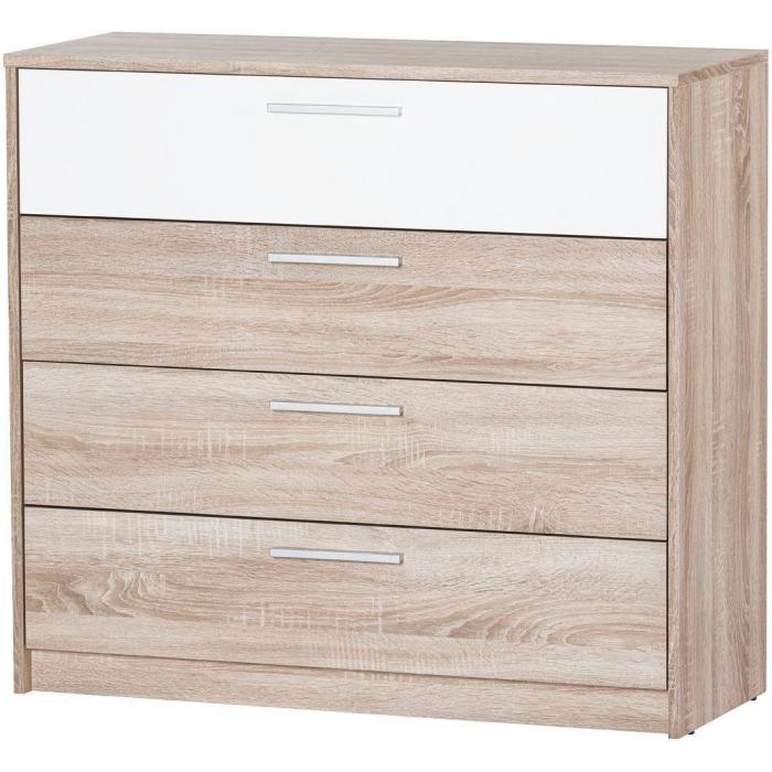 Komoda Milo to mebel idealny do sypialni. Kolor mebla biały/dąb sonoma wpasuje się w wiele aranżacji w nowoczesnych wnętrzach jak również we wnętrzach klasycznych. Szafka posiada szuflady. Płyta laminowana to płyta, z której wykonano komodę. Do kompletu można dokupić inne meble z kolekcji.