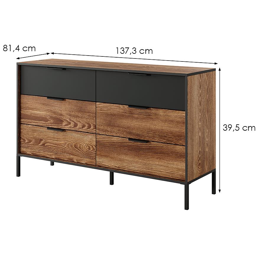 Komoda wyposażona jest w aż 6 szuflad, z czego dwie zostały ozdobione antracytowym kolorem, co dodaje meblowi wyjątkowego charakteru i subtelnie łamie monotonię. Dzięki temu użytkownik ma możliwość przechowywania różnorodnych przedmiotów, zachowując przy tym porządek w pomieszczeniu.
