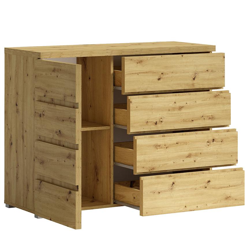 Jednodrzwiowa konstrukcja komody ułatwia organizację przechowywanych przedmiotów, jednocześnie dodając elegancji całej kompozycji. Jasne drewnopodobne wybarwienie nadaje meblowi naturalnego charakteru, a kolor dębu artisan w matowym wykończeniu frontów podkreśla nowoczesny design.