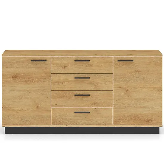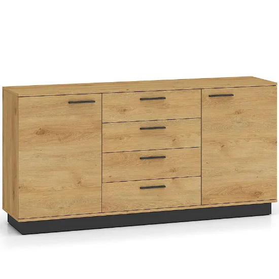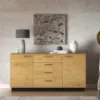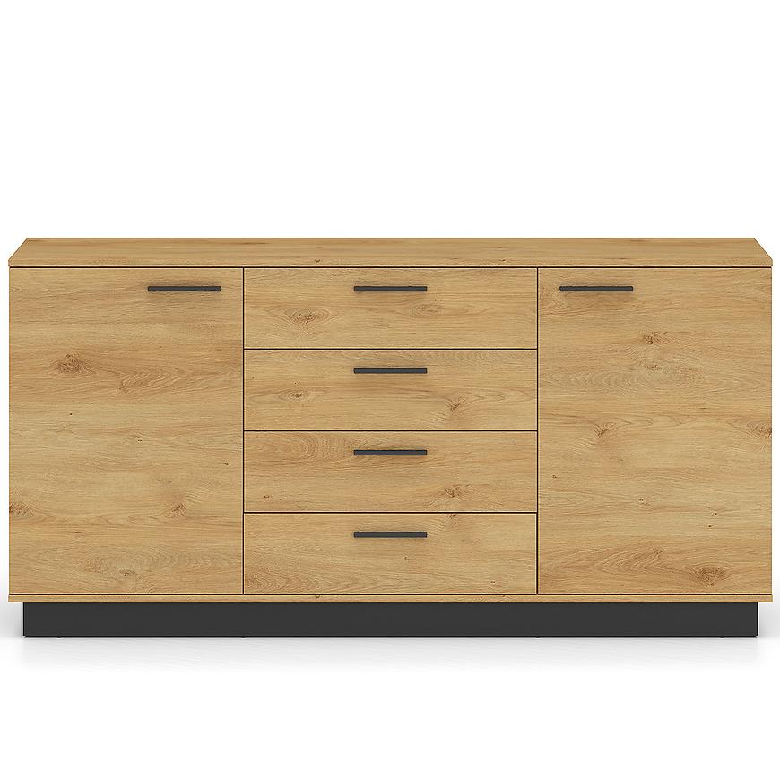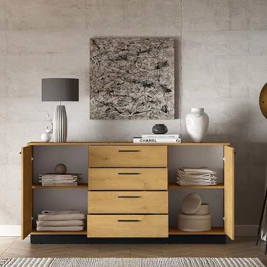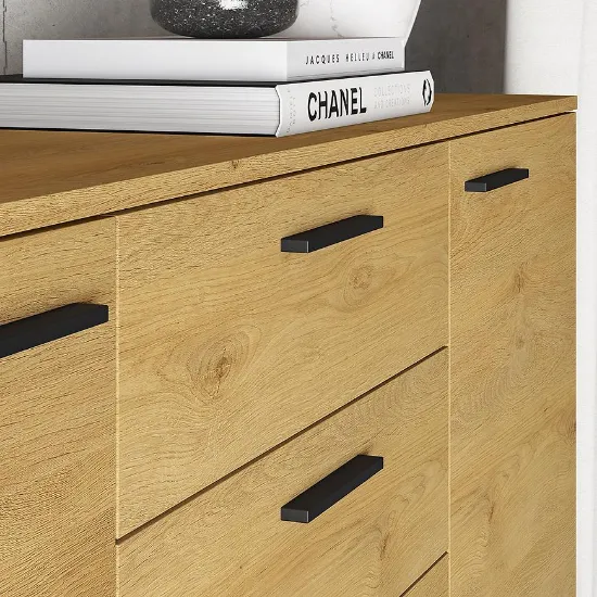Kolekcja mebli do pokoju dziennego Modesto to harmonijne połączenie stylu i funkcjonalności, które idealnie wpisuje się w nowoczesne wnętrza. Wykonana z wysokiej jakości płyty wiórowej laminowanej, cechuje się trwałością i odpornością na codzienne użytkowanie. Wyjątkowy dekor dąb stylowy w zestawieniu z elegancką czernią nadaje meblom ponadczasowy charakter i subtelną elegancję. Matowe wykończenie frontów i korpusów podkreśla nowoczesny design kolekcji, sprawiając, że stanowi ona doskonałe dopełnienie współczesnych aranżacji.
