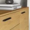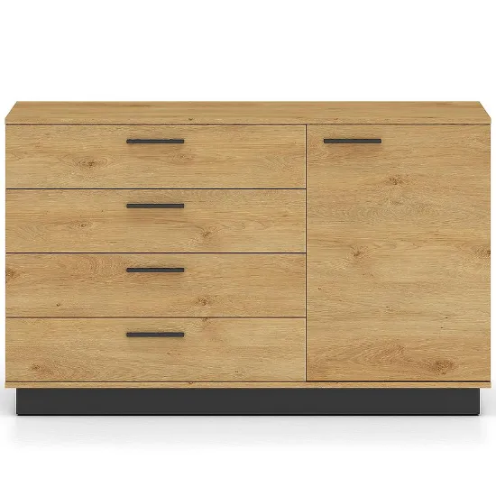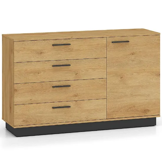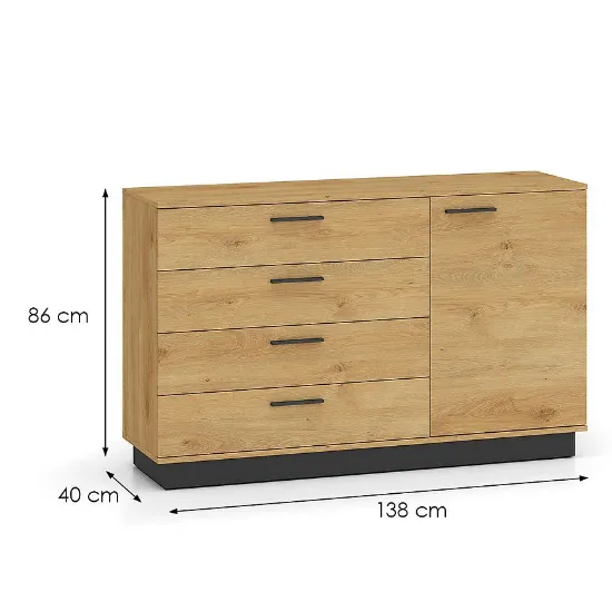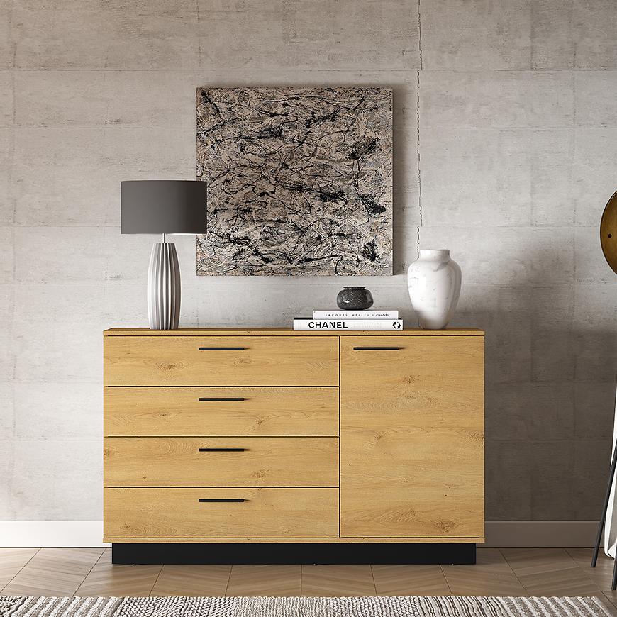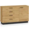 Kolekcja mebli do pokoju dziennego Modesto to harmonijne połączenie stylu i funkcjonalności, które idealnie wpisuje się w nowoczesne wnętrza. Wykonana z wysokiej jakości płyty wiórowej laminowanej, cechuje się trwałością i odpornością na codzienne użytkowanie. Wyjątkowy dekor dąb stylowy w zestawieniu z elegancką czernią nadaje meblom ponadczasowy charakter i subtelną elegancję. Matowe wykończenie frontów i korpusów podkreśla nowoczesny design kolekcji, sprawiając, że stanowi ona doskonałe dopełnienie współczesnych aranżacji.
