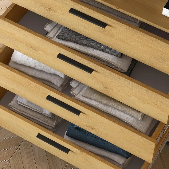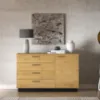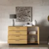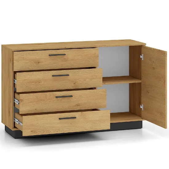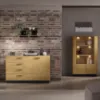 W skład kolekcji Modesto wchodzą różnorodne elementy, które pozwalają na funkcjonalne zagospodarowanie przestrzeni. Komoda dwudrzwiowa z szufladami oraz komoda jednodrzwiowa z szufladami zapewniają mnóstwo miejsca do przechowywania, ułatwiając organizację przedmiotów codziennego użytku. Witryna jednodrzwiowa i witryna dwudrzwiowa z półkami pozwalają na efektowne wyeksponowanie dekoracji, książek lub szkła. Opcjonalne oświetlenie LED dostępne za dodatkową opłatą nadaje wnętrzu wyjątkowego klimatu. Półka to doskonałe miejsce na ulubione dodatki, a szafka RTV z szafkami i półkami zapewnia wygodne miejsce na sprzęt multimedialny. Całość dopełnia pojemna szafa z półką i drążkiem na ubrania, która zwiększa funkcjonalność kolekcji.