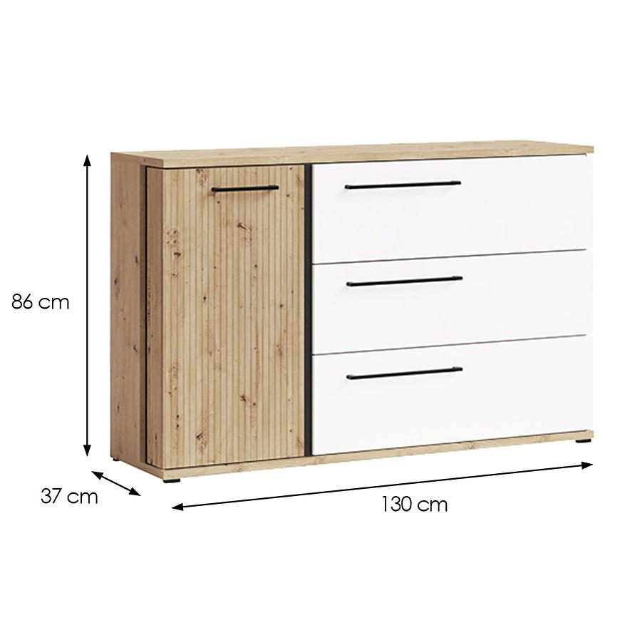 Komoda posiada jasne drewnopodobne wybarwienie, które nadaje jej naturalny i przyjemny wygląd. Fronty komody wykonane są z matowej płyty MDF, co dodaje im elegancji i nowoczesności. Kolor frontów to harmonijne połączenie bieli z dębem artisan, tworzące stylowy efekt wizualny.