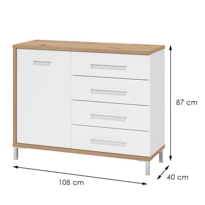 Komoda Mondego wpasuje się w każdą przestrzeń. Posiada 1 zamykaną szafkę oraz 4 szuflady, które pozwolą na odpowiednie zagospodarowanie. Mondego doskonale odnajdzie się w każdym pomieszczeniu, również w jadalni czy salonie.
