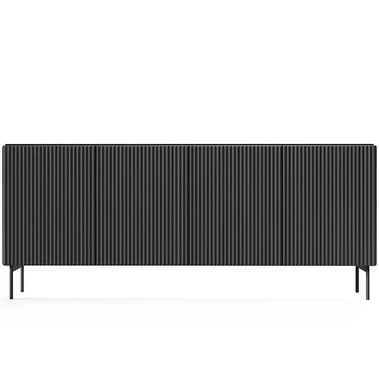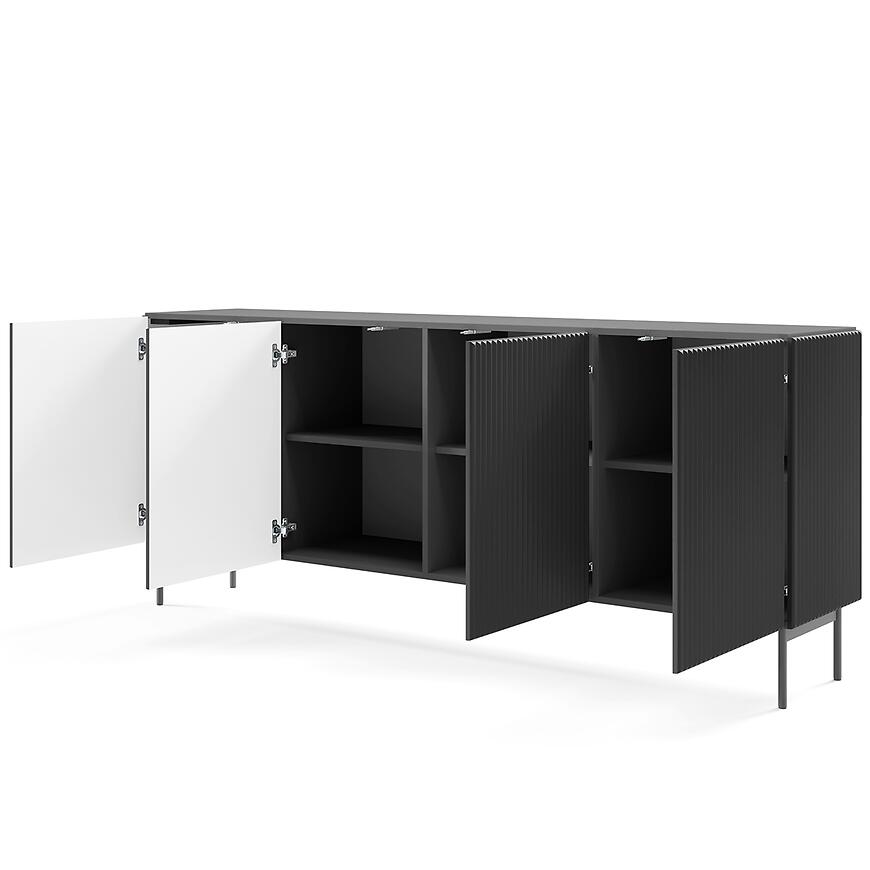 Komoda Muti B 195 4d Czarny nie posiada oświetlenia, dzięki czemu bryła zachowuje minimalistyczną formę. Gładkie fronty i jednolite wybarwienie podkreślają nowoczesny charakter mebla i wprowadzają elegancję do wnętrza.