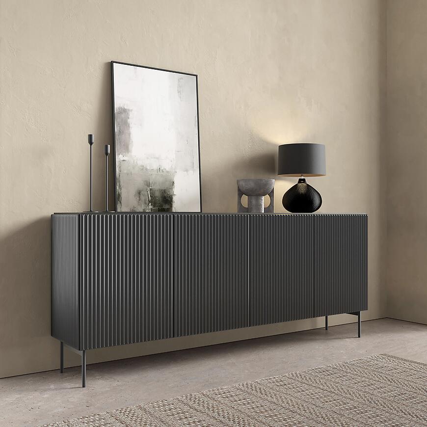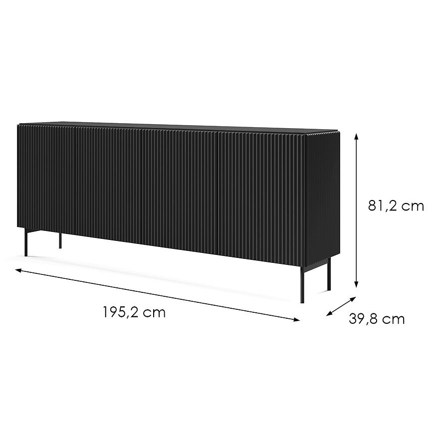 Bryła o szerokości 195,2 cm, wysokości 81,2 cm i głębokości 39,8 cm oferuje dużą powierzchnię użytkową, zapewniając przestrzeń do przechowywania przedmiotów w sposób uporządkowany. Kilkudrzwiowa konstrukcja umożliwia łatwy dostęp do wnętrza komody, a jednocześnie podkreśla elegancki, minimalistyczny charakter bryły.