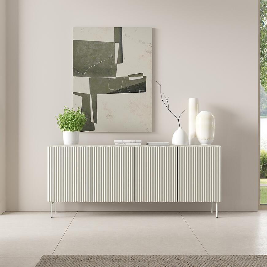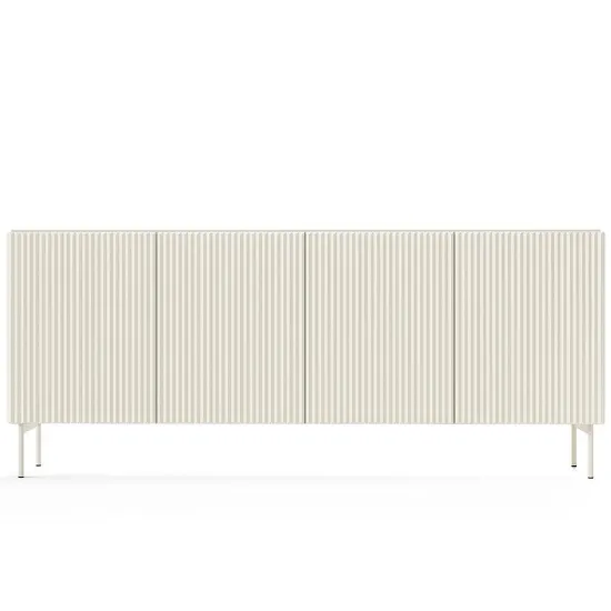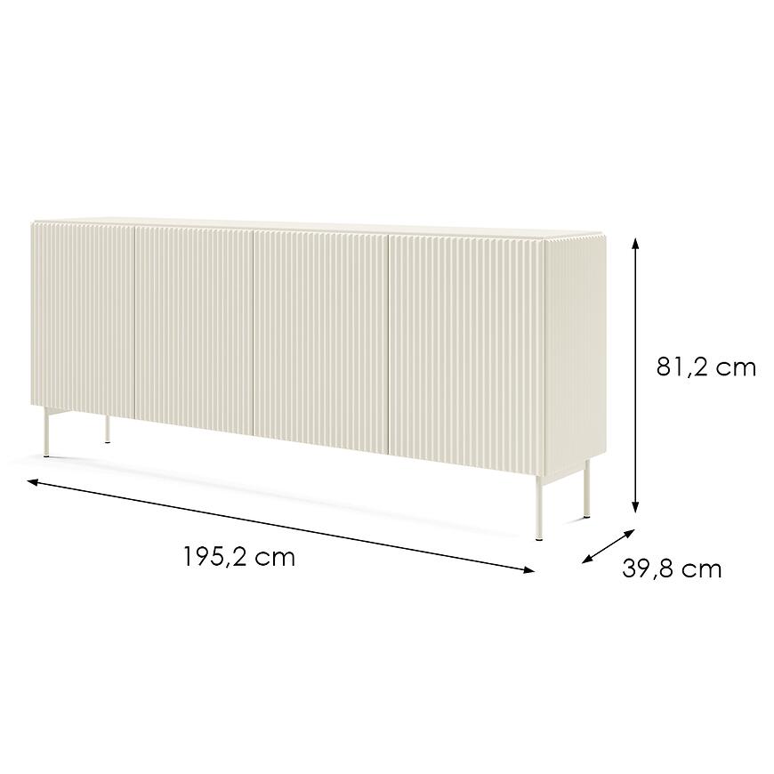 Komoda Muti B 195 4d Kaszmir to nowoczesny mebel łączący eleganckie, jasne wybarwienie z funkcjonalną i prostą konstrukcją. Matowe fronty i korpus w jednolitym kolorze kaszmir tworzą spójną bryłę o minimalistycznym charakterze, wprowadzając do wnętrza nowoczesny i stylowy akcent.