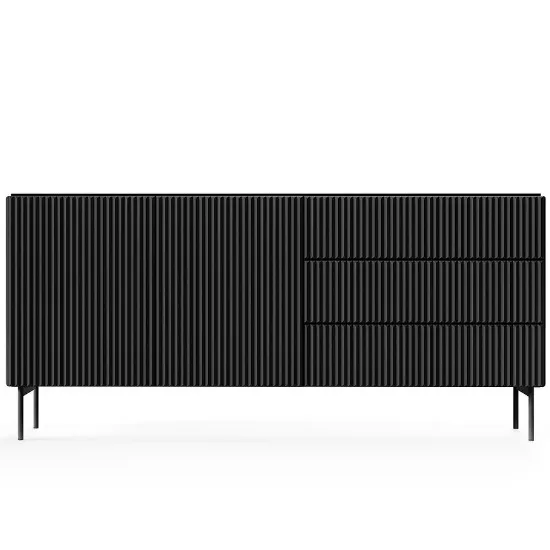 Komoda Muti C 177 2d3s Czarny to nowoczesny mebel łączący minimalistyczny design z praktyczną funkcjonalnością. Fronty i korpus w głębokiej czerni tworzą elegancką, spójną bryłę, a matowe wykończenie podkreśla nowoczesny charakter komody, jednocześnie ograniczając widoczność zabrudzeń i odcisków palców.
