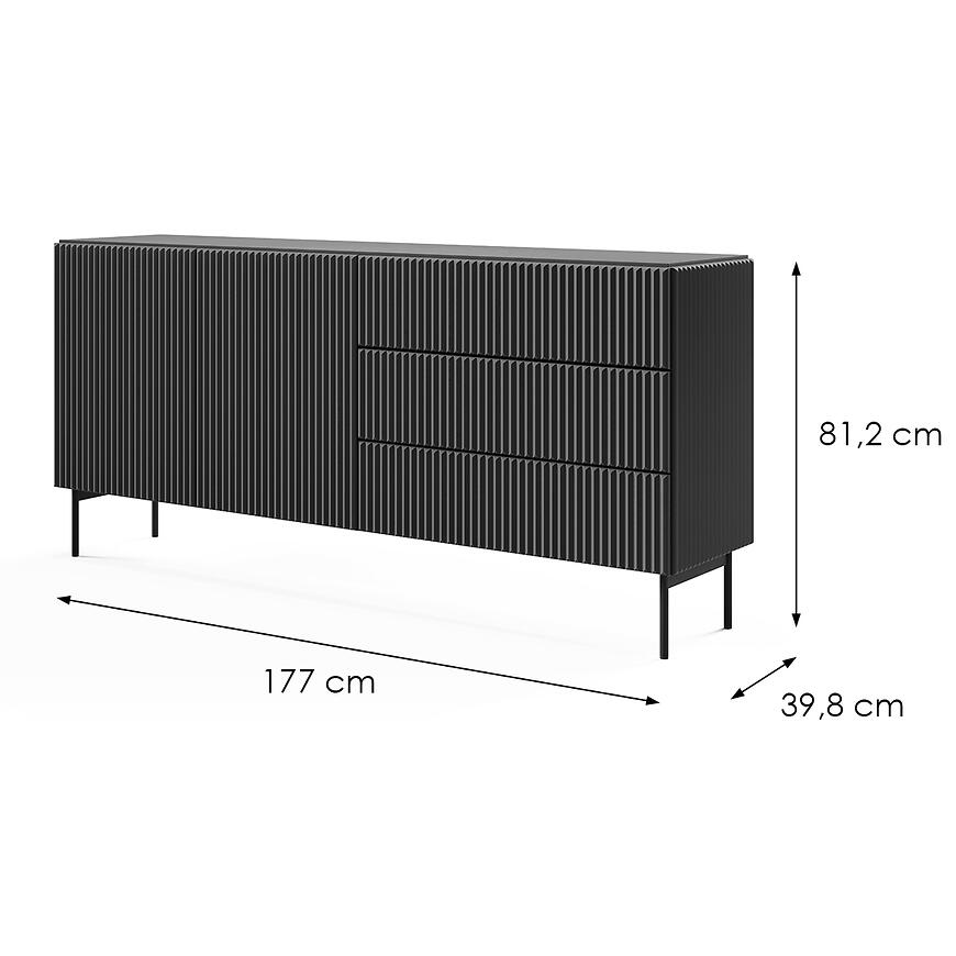 Bryła o szerokości 177 cm, wysokości 81,2 cm i głębokości 39,8 cm zapewnia optymalne proporcje oraz przestrzeń do przechowywania różnych przedmiotów. Dwudrzwiowa konstrukcja w połączeniu z trzema szufladami pozwala na wygodne segregowanie i organizowanie przedmiotów w sposób uporządkowany.