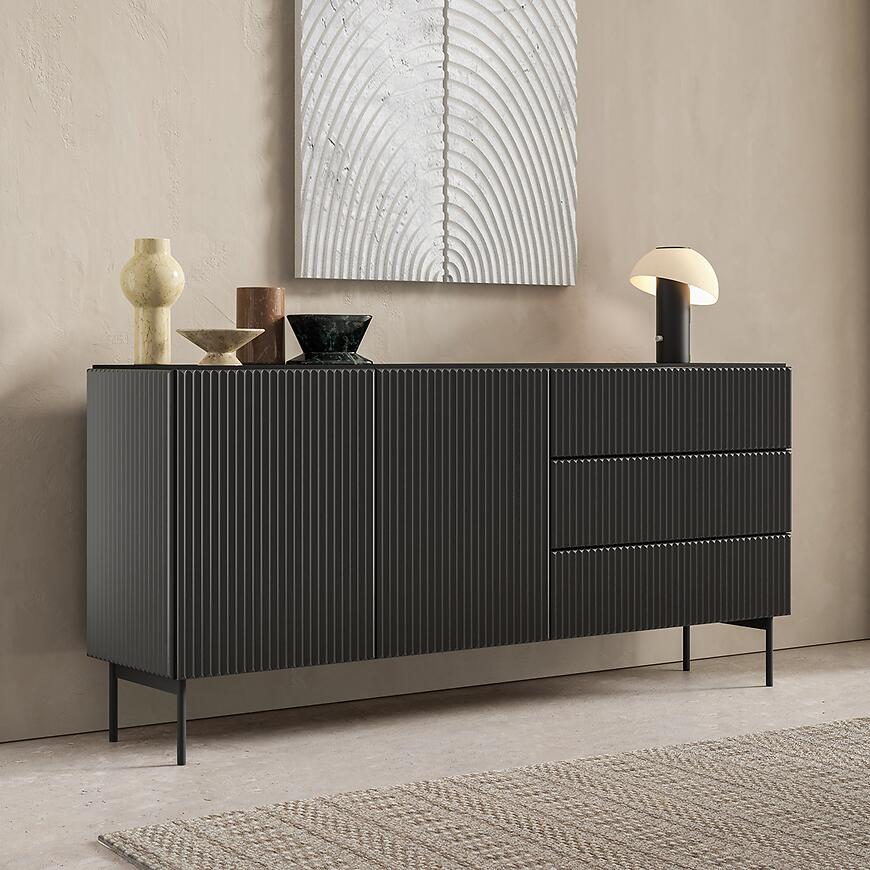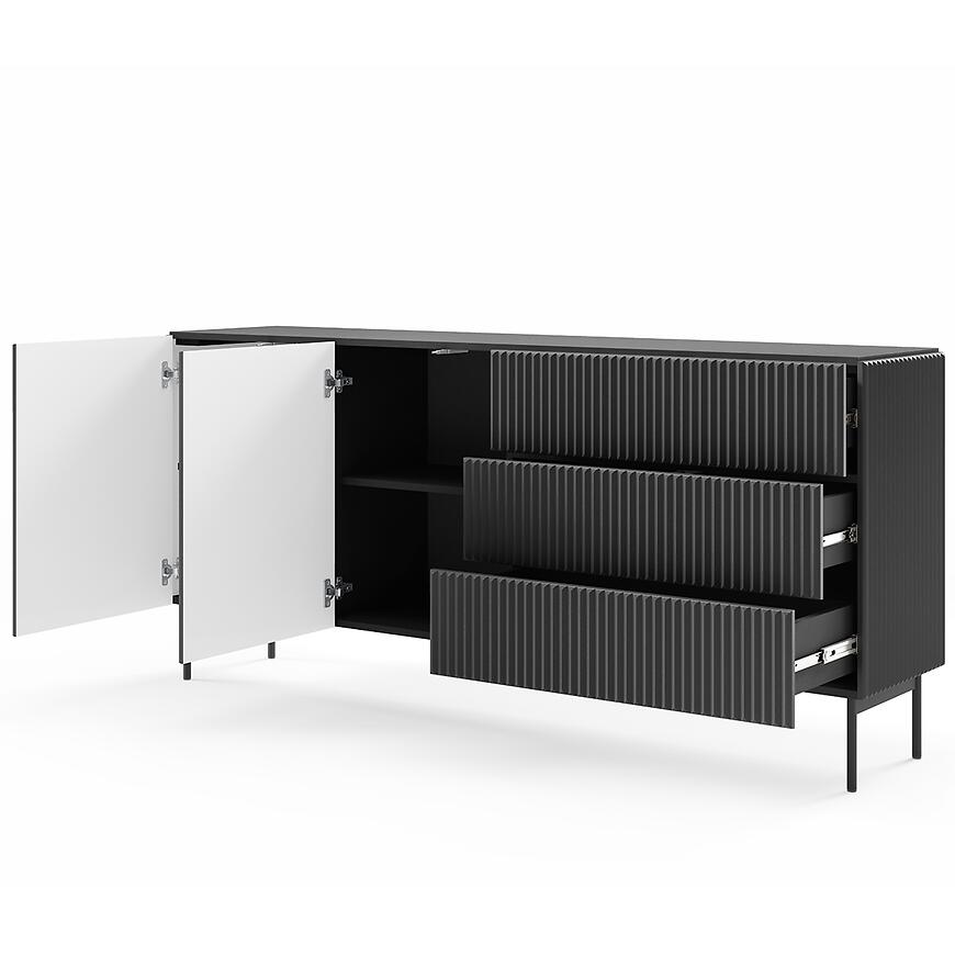 Komoda Muti C 177 2d3s Czarny nie posiada oświetlenia, dzięki czemu zachowuje jednolitą, minimalistyczną formę. Gładkie fronty i jednolite wybarwienie podkreślają nowoczesny charakter bryły, wprowadzając elegancję do wnętrza.
