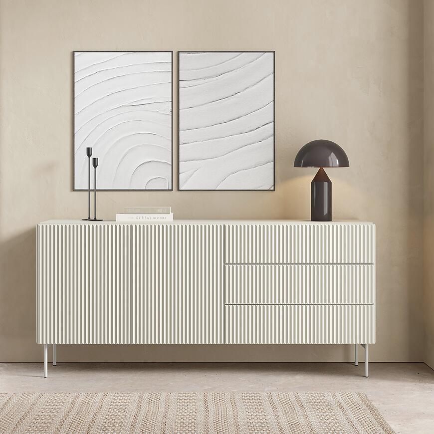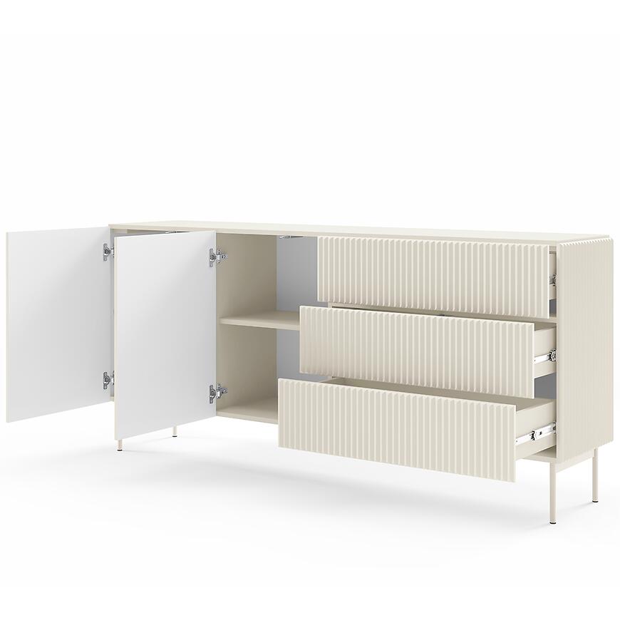Komoda Muti C 177 2d3s Kaszmir to nowoczesny, elegancki mebel z matowym wykończeniem i jasnym wybarwieniem. Dwudrzwiowa konstrukcja, trzy szuflady, solidne materiały i minimalistyczny design kolekcji MUTI tworzą funkcjonalny i estetyczny mebel, idealny do nowoczesnych wnętrz.