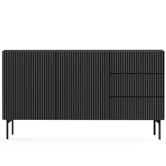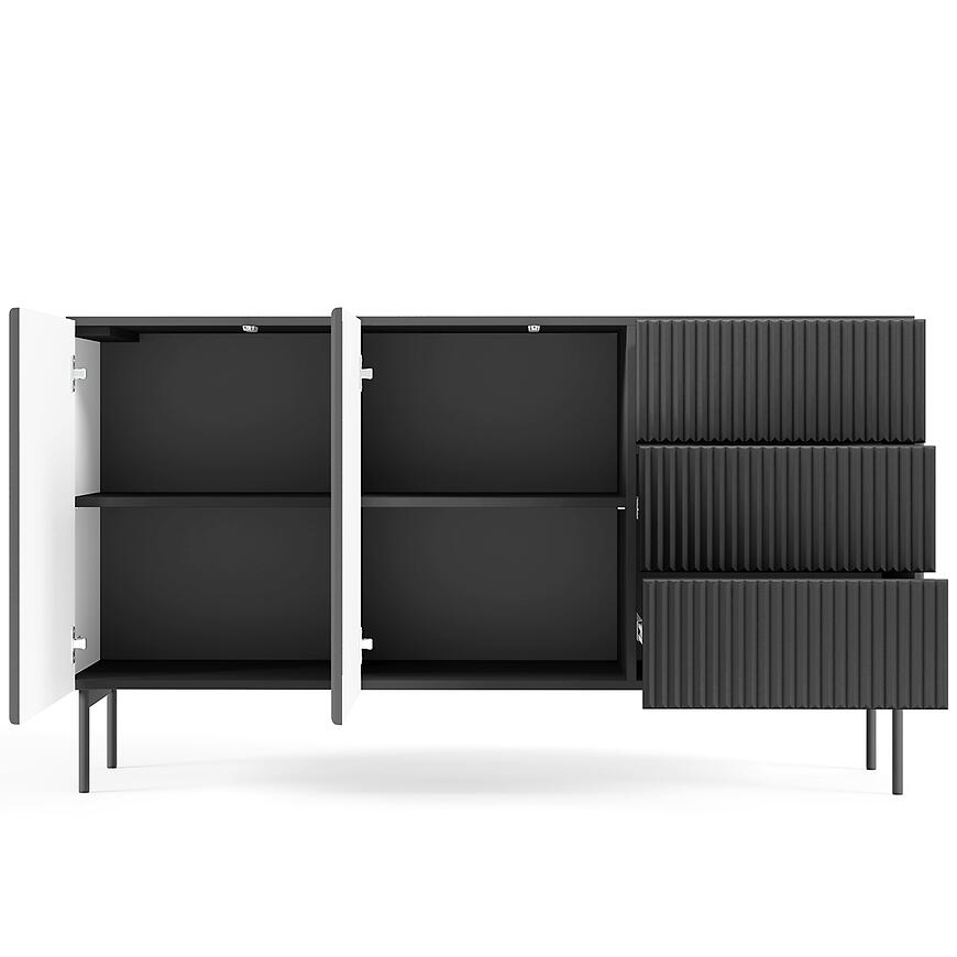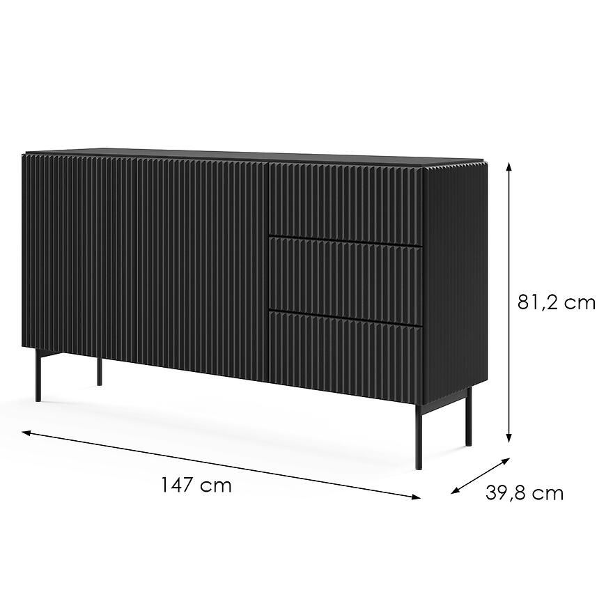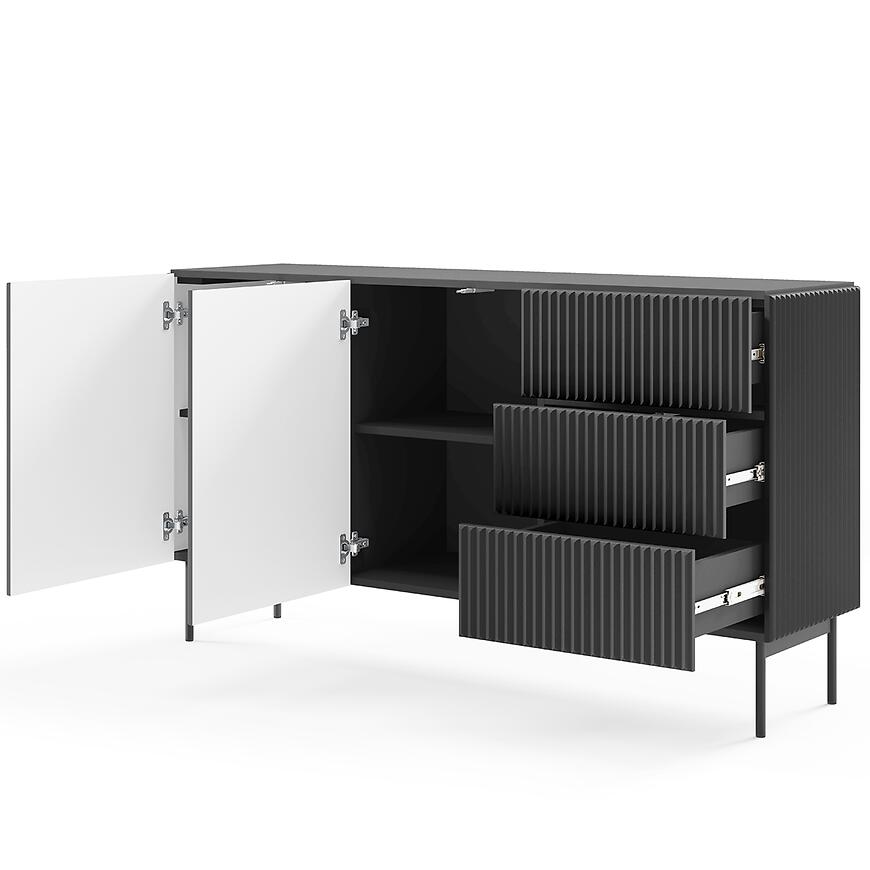 Komoda Muti D 147 2d3s Czarny to nowoczesny i elegancki mebel z matowym wykończeniem, który łączy funkcjonalność z minimalistycznym designem kolekcji MUTI, oferując praktyczne rozwiązanie dla nowoczesnych wnętrz.