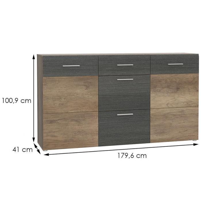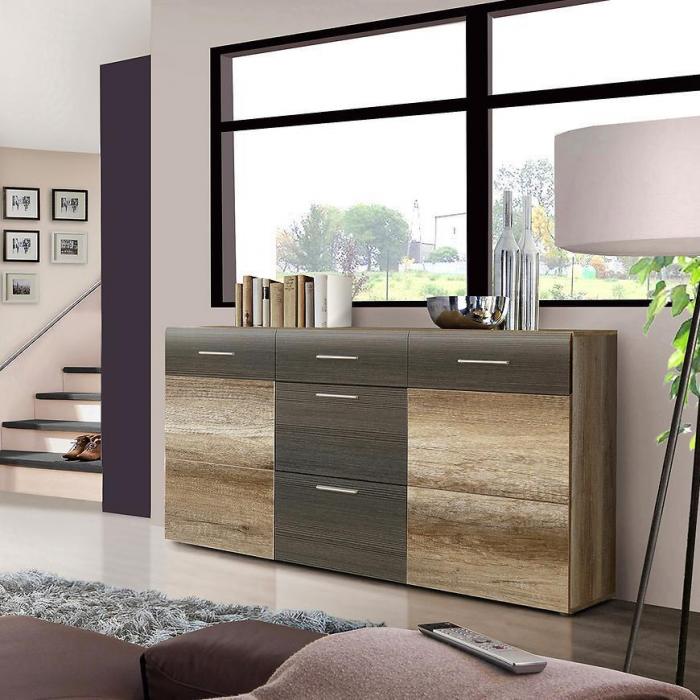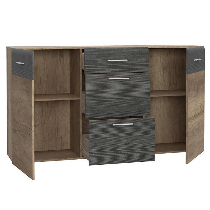Komoda Nabou wpasuje się w każdą przestrzeń. Posiada 2 zamykane szafki oraz 3 szuflady, które pozwolą na odpowiednie zagospodarowanie. Nabou doskonale odnajdzie się w każdym pomieszczeniu, również w jadalni czy salonie.