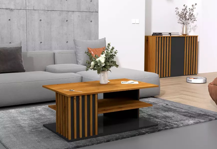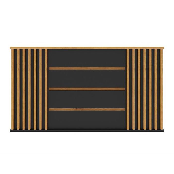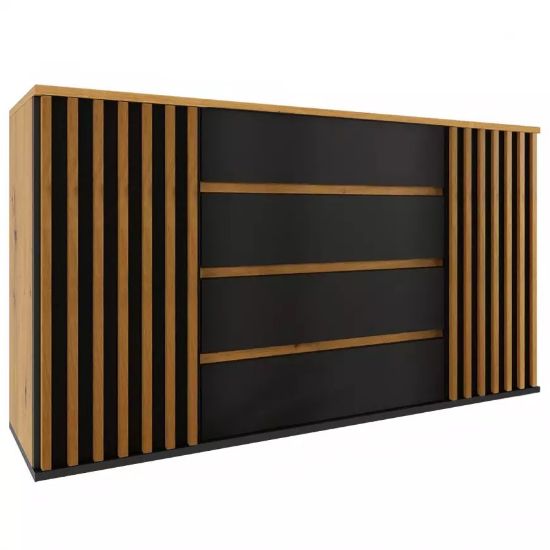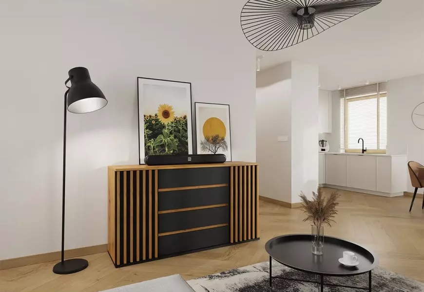 Komoda Nairobi w kolorze dąb artisan/czarny to przede wszystkim nowoczesność i funkcjonalność w jednym. Mebel doskonale sprawdzi się w każdym salonie. Materiał wykonania to płyta wiórowa laminowana. Komoda posiada cztery szuflady i dwie szafki dzięki czemu ma łatwy dostęp do wnętrza. Wygląd mebli jest nowoczesny, a zarazem uniwersalny. Mebel będzie pasował do wielu pomieszczeń jak np. jadalni czy pokoju dziennego. Meble jest bardzo pojemny, dlatego sprawdzi się w każdym pomieszczeniu - zarówno w sypialni, pokoju dziennym, młodzieżowym, czy też salonie. Mebel do samodzielnego montażu.