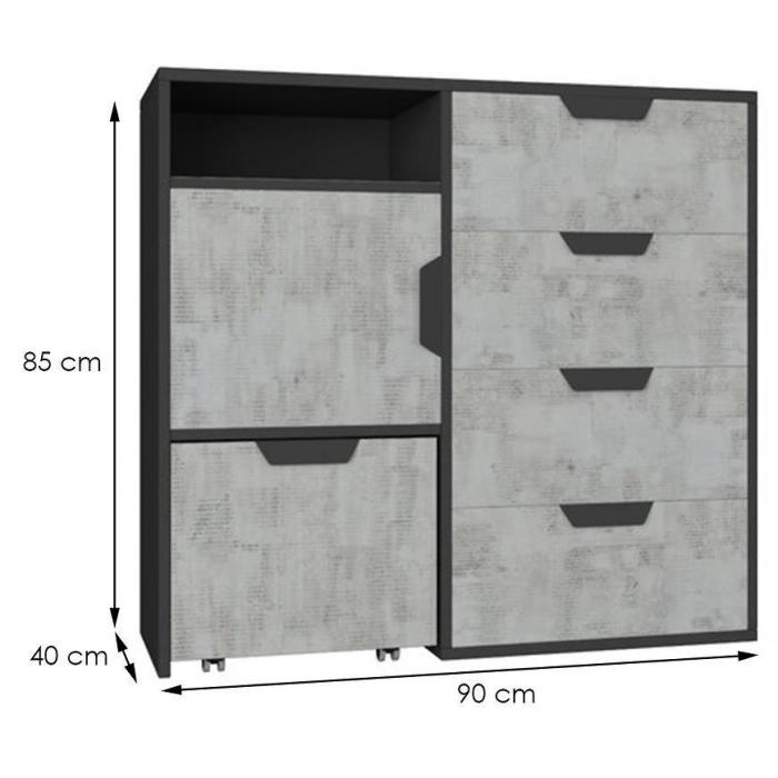 Doskonałym wyborem do pokoju młodzieżowym będzie komoda w kolorze grafit/enigma z serii Nano, materiał wykonania to płyta laminowana. Komoda posiada drzwiczki oraz szuflady dzięki czemu ma łatwy dostęp do wnętrza. Komoda dopełni również wystrój salonu, czy przedpokoju, stanowiąc wygodne miejsce do przechowywania mniejszych i większych rzeczy. Mebel do samodzielnego montażu.