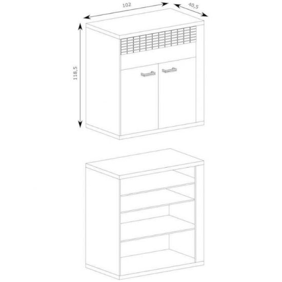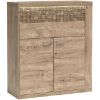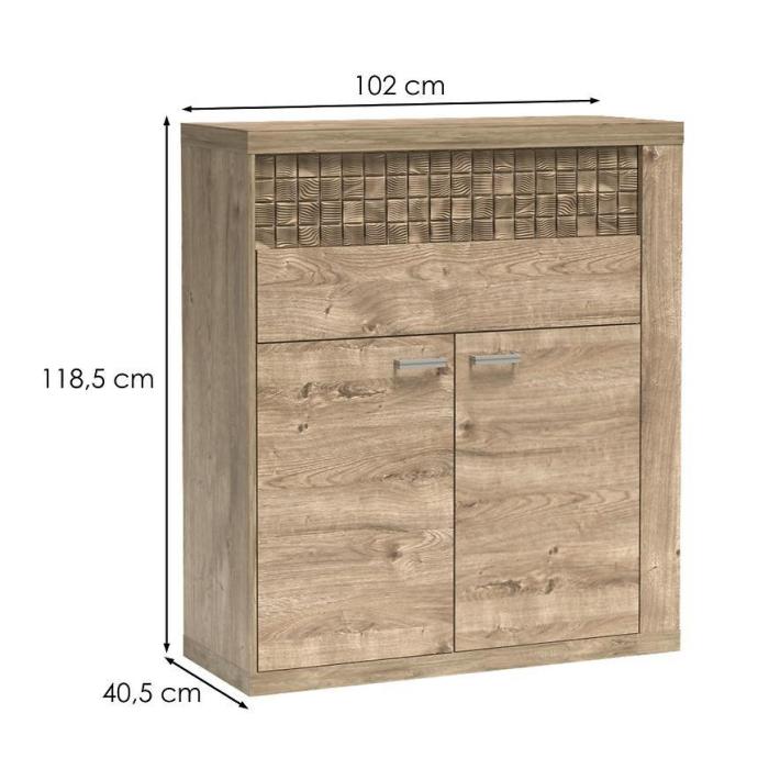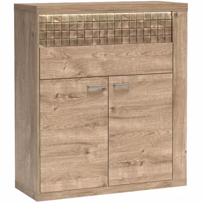 Komoda Natural to mebel idealny do pokoju dziennego lub salonu. Wpasuje się w wiele aranżacji w nowoczesnych wnętrzach jak również we wnętrzach klasycznych. Ciekawym elementem dekoracyjnym jest drewniany, panel w kształcie szachownicy. Szafka posiada drzwiczki dzięki czemu ma łatwy dostęp do wnętrza oraz odpowiednią przestrzeń do przechowywania odzieży oraz innych przedmiotów. Płyta laminowana to płyta, z której wykonano komodę. Posiada szufladę z systemem "Push to Open". Dodatkowo wyposażona w cichy domyk i metalowe uchwyty. Do kompletu można dokupić inne meble z kolekcji