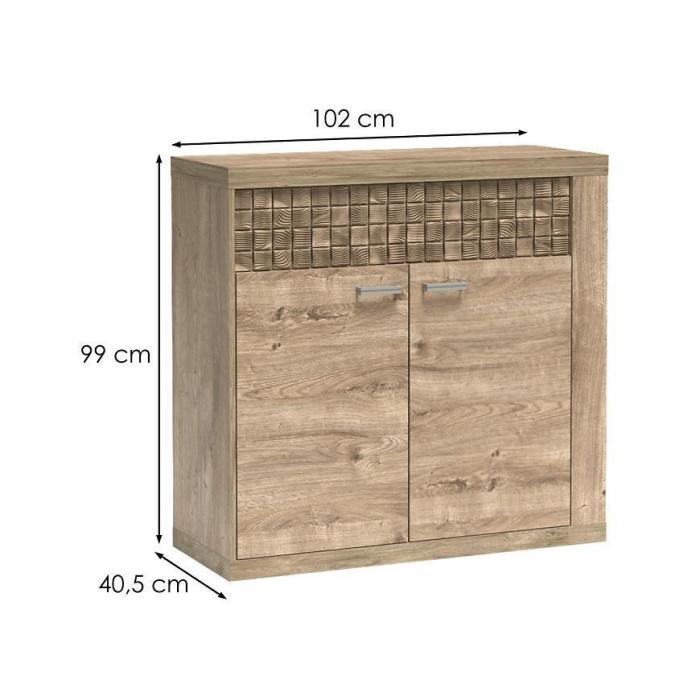 Komoda Natural to mebel idealny do pokoju dziennego lub salonu. Wpasuje się w wiele aranżacji w nowoczesnych wnętrzach jak również we wnętrzach klasycznych. Ciekawym elementem dekoracyjnym jest drewniany, panel w kształcie szachownicy. Szafka posiada drzwiczki dzięki czemu ma łatwy dostęp do wnętrza oraz odpowiednią przestrzeń do przechowywania odzieży oraz innych przedmiotów. Płyta laminowana to płyta, z której wykonano komodę. Posiada szufladę z systemem "Push to Open". Dodatkowo komoda posiada cichy domyk i metalowe uchwyty. Do kompletu można dokupić inne meble z kolekcji