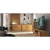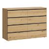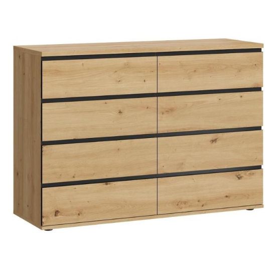 Komoda Naxos 03 w kolorze dąb artisan z czarnymi akcentami to nowoczesny i funkcjonalny mebel, który łączy elegancję z praktycznym zastosowaniem. W całości wykonana z laminowanej płyty wiórowej, zarówno fronty, jak i korpus posiadają matowe wykończenie, które nadaje komodzie subtelny, ponadczasowy charakter. Model nie posiada drzwi, natomiast wyposażony jest w wieloszufladowe wnętrze, które zapewnia wygodne miejsce do przechowywania odzieży, akcesoriów i innych przedmiotów, umożliwiając utrzymanie porządku w pomieszczeniu.