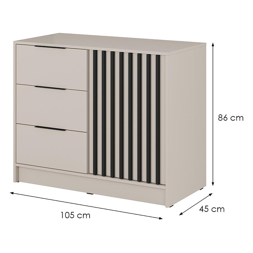 Komoda Nelly to elegancka propozycja dla tych, którzy cenią sobie nowoczesny styl i funkcjonalność. Zaprojektowana z dbałością o detale, komoda posiada jednodrzwiowe fronty w kolorze cashmere, harmonijnie komponujące się z matowym wykończeniem korpusu. Wyposażona w trzy praktyczne szuflady, jest idealnym rozwiązaniem do przechowywania różnorodnych przedmiotów.