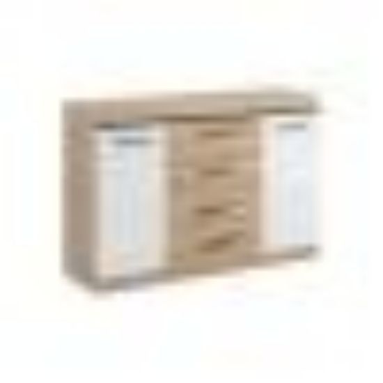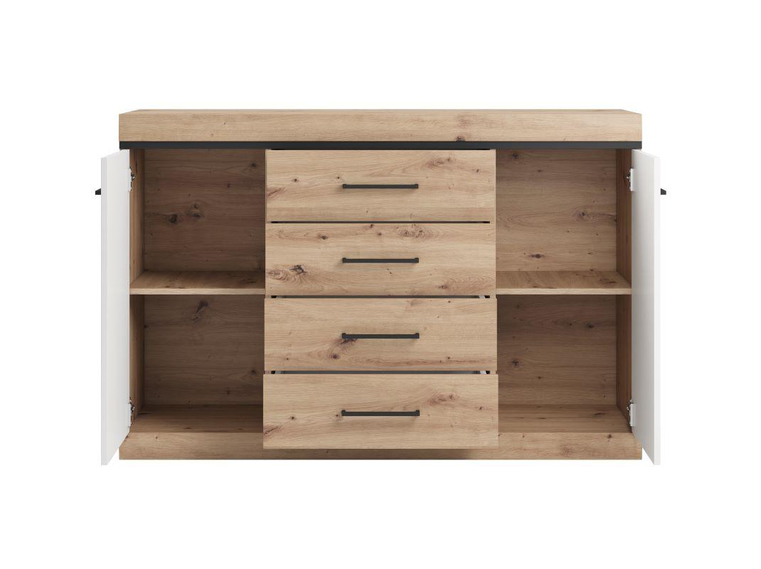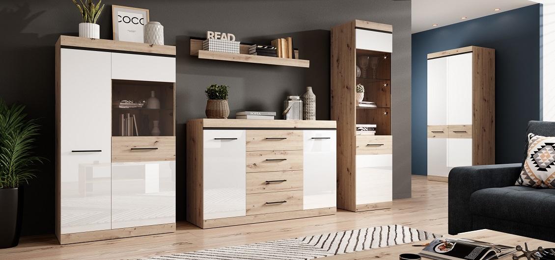 Klasyczna komoda Nelly to mebel idealny do pokoju dziennego lub salonu. Kolor dąb artisan/biały połysk wpasuje się w wiele aranżacji w nowoczesnych wnętrzach jak również we wnętrzach klasycznych. Szafka posiada szuflady i drzwiczki dzięki czemu ma łatwy dostęp do wnętrza oraz odpowiednią przestrzeń do przechowywania odzieży oraz innych przedmiotów. Płyta laminowana to płyta, z której wykonano komodę. Do kompletu można dokupić inne meble z kolekcji.