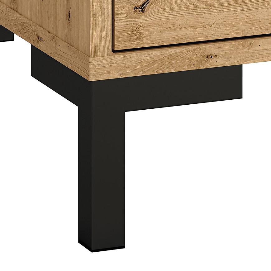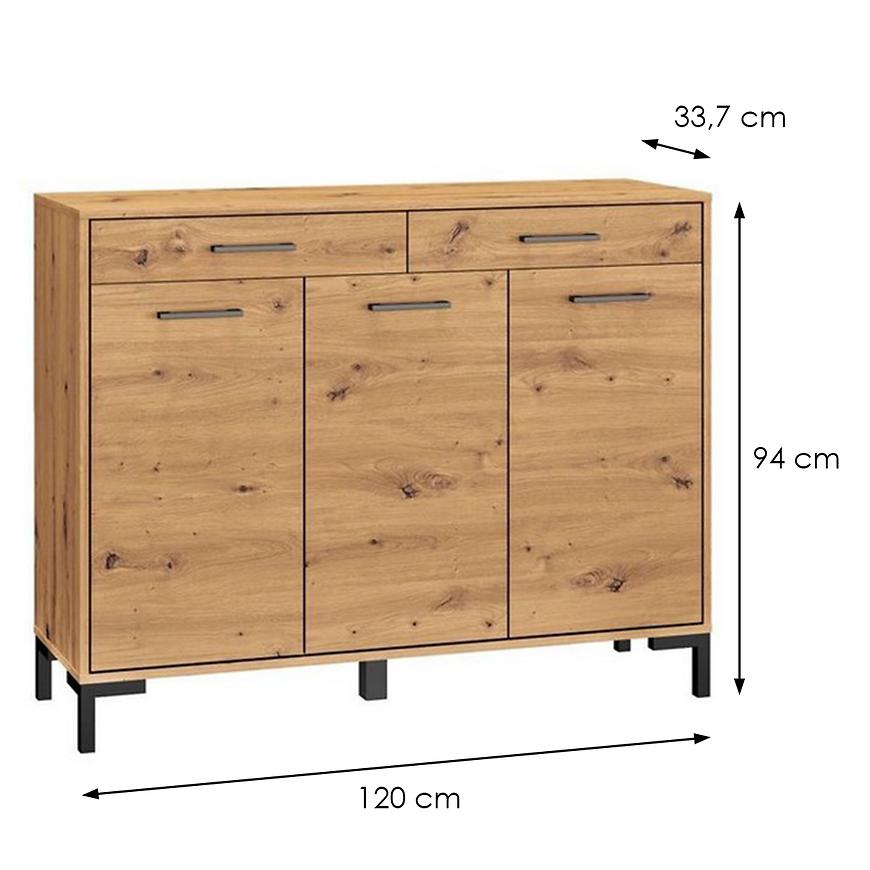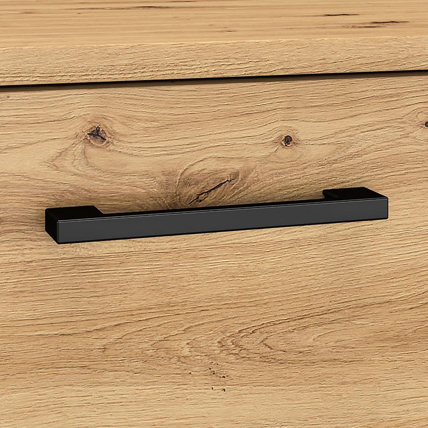 Trzydrzwiowy układ, wzbogacony o dwie szuflady, zapewnia obszerną przestrzeń do przechowywania, umożliwiając jednocześnie uporządkowane rozmieszczenie przedmiotów. Kolor frontów w odcieniu dębu artisan nadaje komodzie charakterystyczny, naturalny wygląd, podkreślając unikalność mebla.