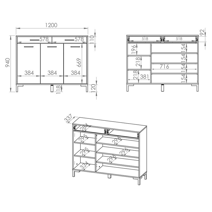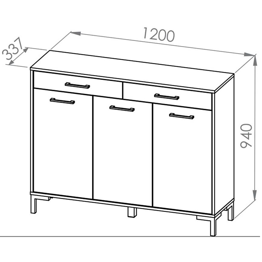Komoda Nevio 14 to niezwykłe połączenie funkcjonalności, stylu loftowego i wysokiej jakości wykonania. Z szerokością 120 cm, wysokością 94 cm i głębokością 33,7 cm, mebel ten doskonale łączy kompaktowe rozmiary z praktycznym designem.