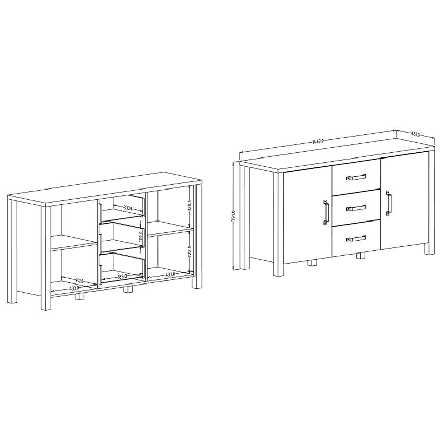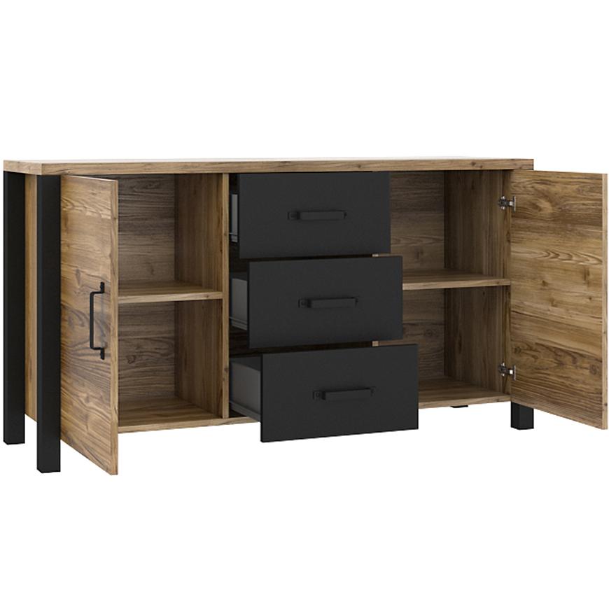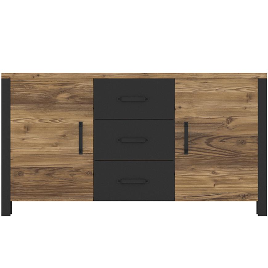 Komoda Olin to idealne rozwiązanie do przestrzeni o stylu loftowym. Jej ciemne drewnopodobne wybarwienie i matowe wykończenie frontów i korpusu nadają jej elegancji i industrialnego uroku. Dwudrzwiowa konstrukcja zapewnia dużą ilość przestrzeni do przechowywania, a trzy szuflady pozwalają na uporządkowanie mniejszych przedmiotów.