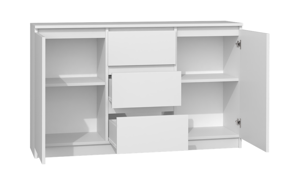 Biała komoda Olympia to mebel idealny do pokoju dziennego, salonu lub sypialni. Kolor mebla wpasuje się w wiele aranżacji w nowoczesnych wnętrzach jak również we wnętrzach klasycznych. Szafka posiada komplet szuflad i drzwiczki dzięki czemu ma łatwy dostęp do wnętrza oraz odpowiednią przestrzeń do przechowywania odzieży lub innych przedmiotów. Płyta laminowana to płyta, z której wykonano komodę.
