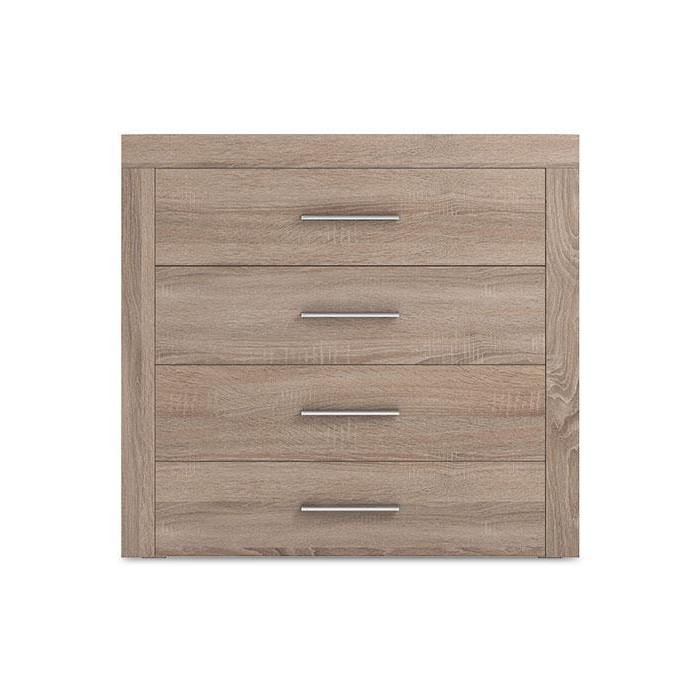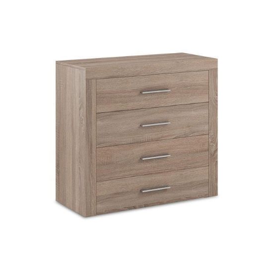 Komoda One to mebel idealny do pokoju dziennego, salonu lub sypialni. Kolor mebla dąb sonoma wpasuje się w wiele aranżacji w nowoczesnych wnętrzach jak również we wnętrzach klasycznych. Szafka posiada komplet szuflad do przechowywania odzieży lub innych przedmiotów. Płyta laminowana o gr. 16 mm to płyta, z której wykonano komodę. Do komody należy domówić kpl. frontów.