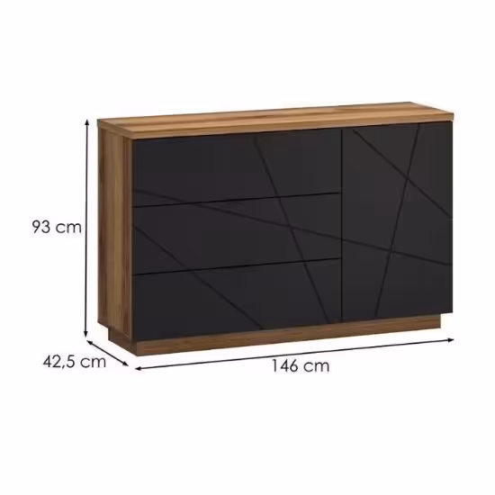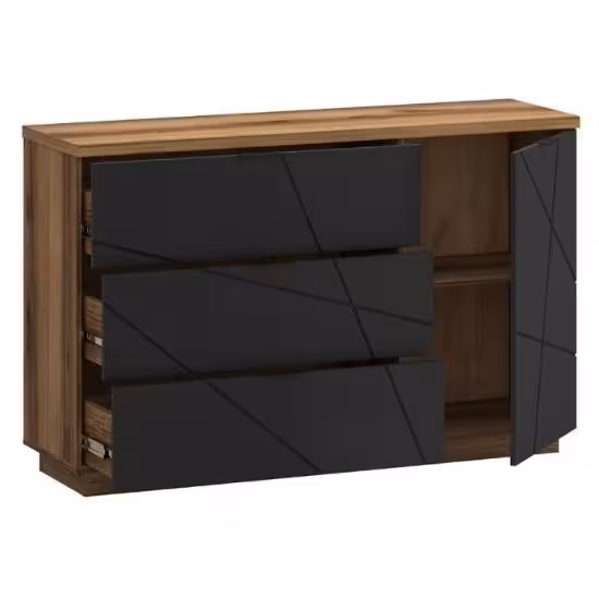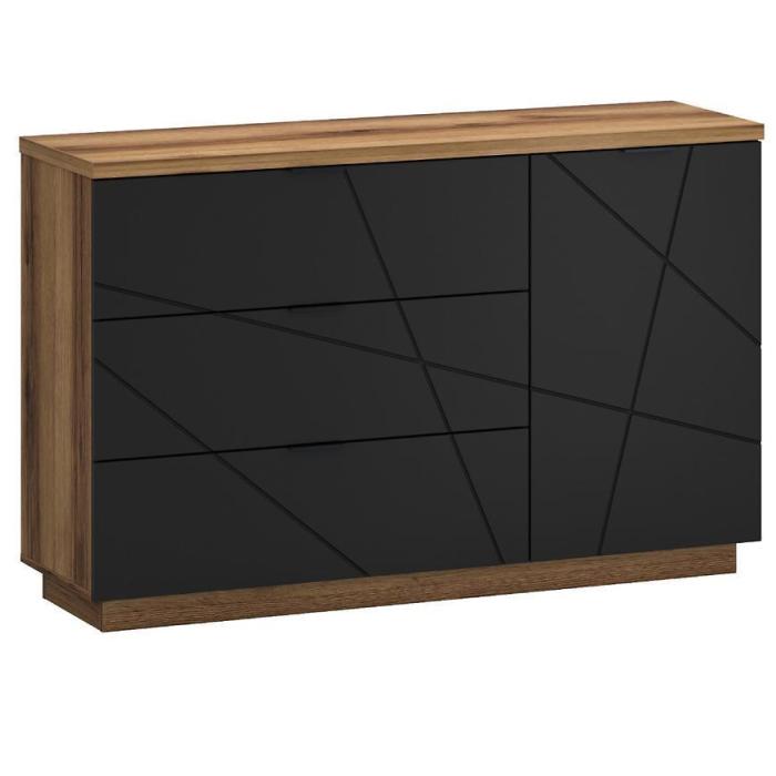 Komoda Orient w kolorze dąb delano ciemny/czarny to przede wszystkim nowoczesność i funkcjonalność w jednym. Mebel doskonale sprawdzi się w każdym salonie. Materiał wykonania to płyta wiórowa laminowana. Komoda posiada jedną szafkę i trzy szuflady dzięki czemu ma łatwy dostęp do wnętrza. Wygląd mebli jest nowoczesny, a zarazem uniwersalny. Mebel będzie pasował do wielu pomieszczeń jak np. jadalni czy pokoju dziennego. Meble jest bardzo pojemny, dlatego sprawdzi się w każdym pomieszczeniu - zarówno w sypialni, pokoju dziennym, młodzieżowym, czy też salonie. Mebel do samodzielnego montażu.