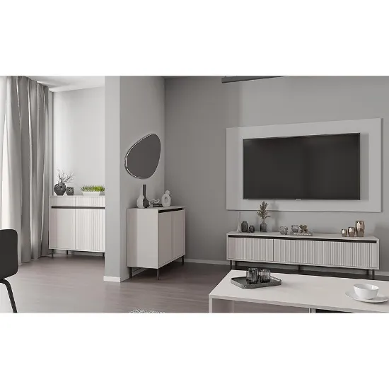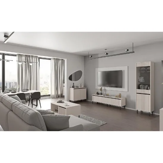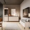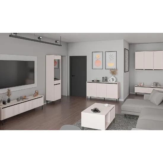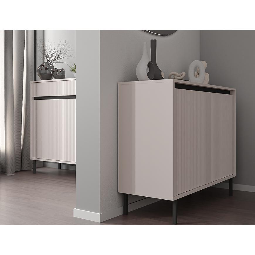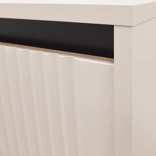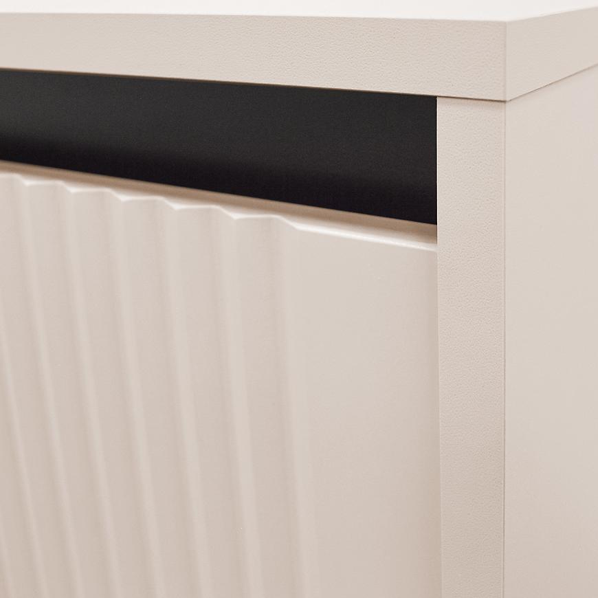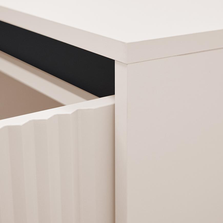 Fronty komody Osaka wykonane zostały z trwałej płyty MDF, co zapewnia jej długą żywotność oraz odporność na codzienne użytkowanie. Delikatny, piaskowy beż dodaje wnętrzu ciepła i harmonii, wprowadzając atmosferę spokoju i elegancji. Matowe wykończenie nie tylko wpływa na estetykę mebla, ale również sprawia, że powierzchnia jest mniej podatna na ślady palców i łatwa do utrzymania w czystości. Konstrukcja korpusu, wykonana z płyty wiórowej laminowanej, zapewnia stabilność i solidność, dzięki czemu komoda posłuży przez długie lata.