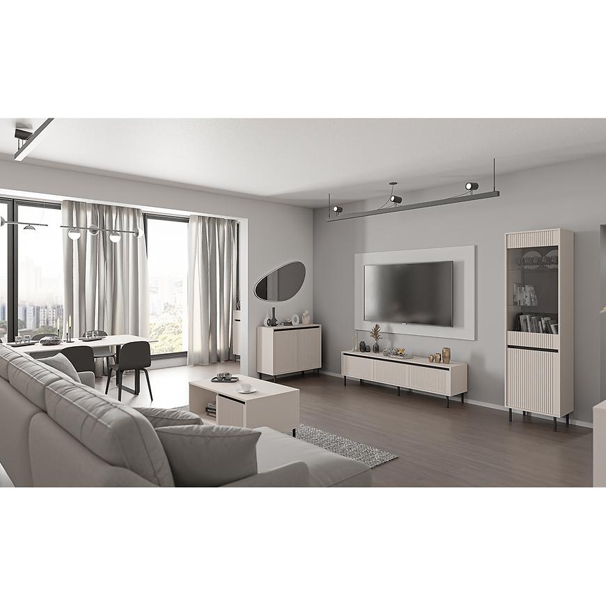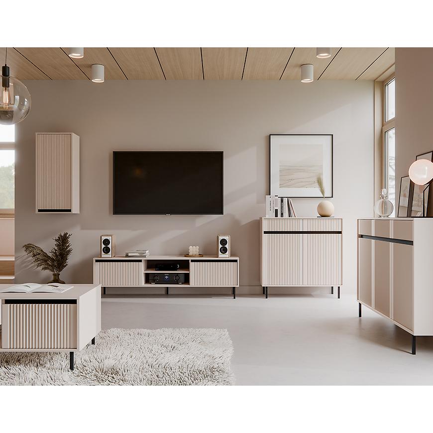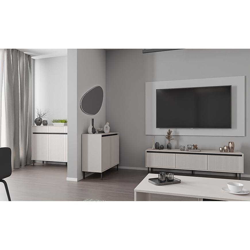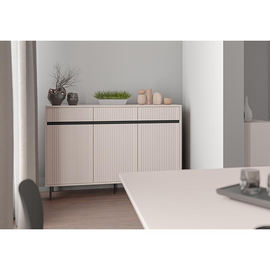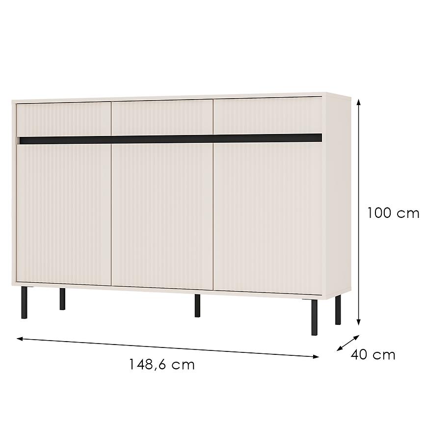 Komoda jest trzydrzwiowa i wyposażona w trzy praktyczne szuflady, które zapewniają dużo miejsca do przechowywania. Fronty wykonane z wysokiej jakości płyty MDF wyróżniają się trwałością oraz eleganckim, matowym wykończeniem, które nadaje całości subtelnego charakteru. Powierzchnia w matowej teksturze łatwo wkomponowuje się w otoczenie, nie odciągając nadmiernie uwagi od innych elementów dekoracyjnych, a jednocześnie podkreśla nowoczesny styl pomieszczenia.