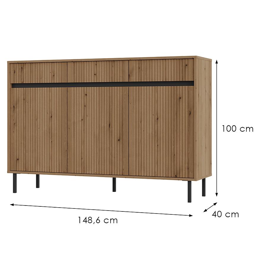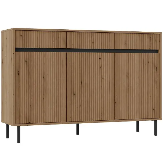 Komoda jest trzydrzwiowa i wyposażona w trzy praktyczne szuflady, które zapewniają dużo miejsca do przechowywania. Fronty wykonane z wysokiej jakości płyty MDF wyróżniają się trwałością oraz eleganckim, matowym wykończeniem, które nadaje całości subtelnego charakteru. Powierzchnia w matowej teksturze łatwo wkomponowuje się w otoczenie, nie odciągając nadmiernie uwagi od innych elementów dekoracyjnych, a jednocześnie podkreśla nowoczesny styl pomieszczenia.