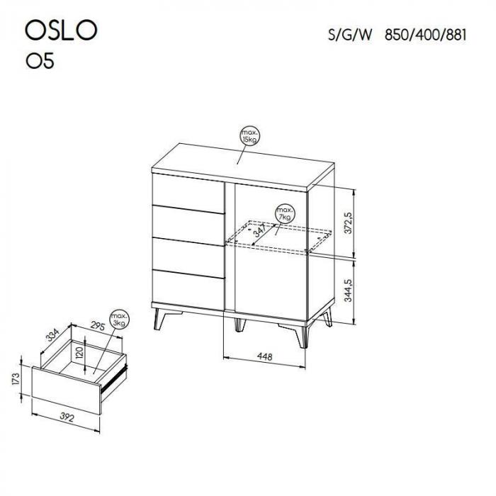 Komoda Oslo 05, jednodrzwiowa z czterema szufladami. Wykonana w kolorze dąb riva/biały połysk. Produkt do samodzielnego montażu.