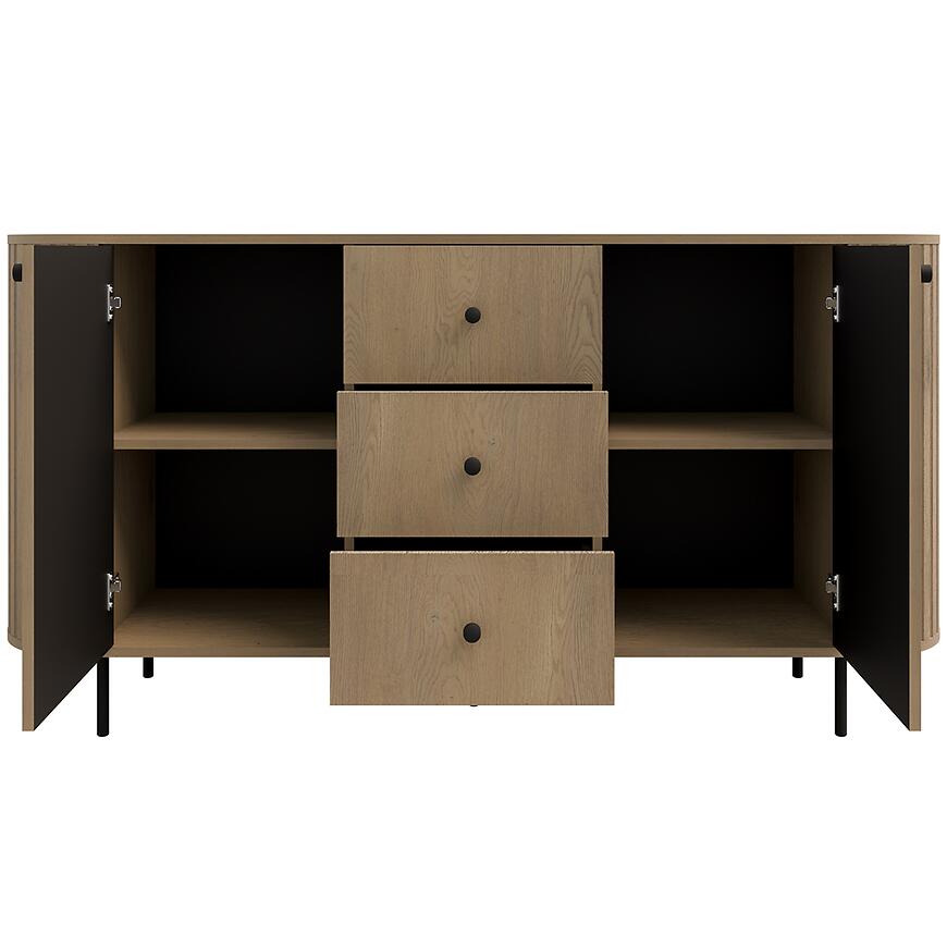 Komoda wyposażona jest w dwoje drzwi oraz trzy pojemne szuflady, co pozwala na wygodne przechowywanie zarówno większych, jak i drobniejszych przedmiotów. Szuflady umożliwiają uporządkowanie akcesoriów, dokumentów lub dodatków domowych, natomiast przestrzeń za drzwiami kryje większe elementy wyposażenia.